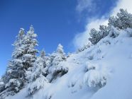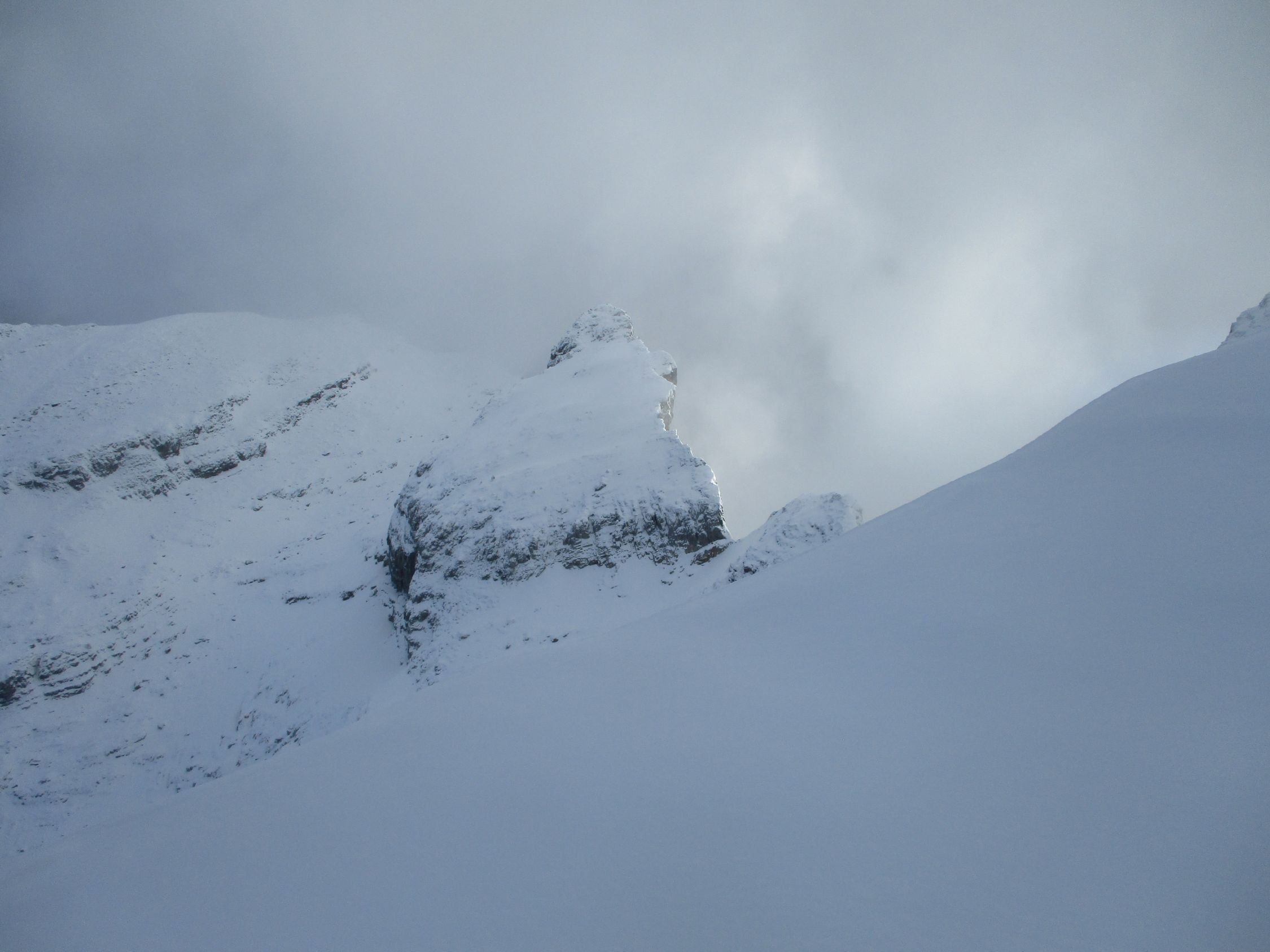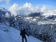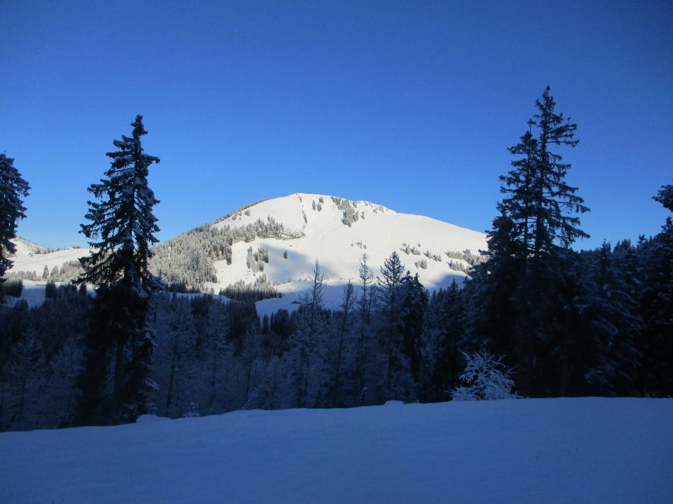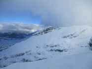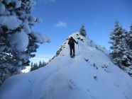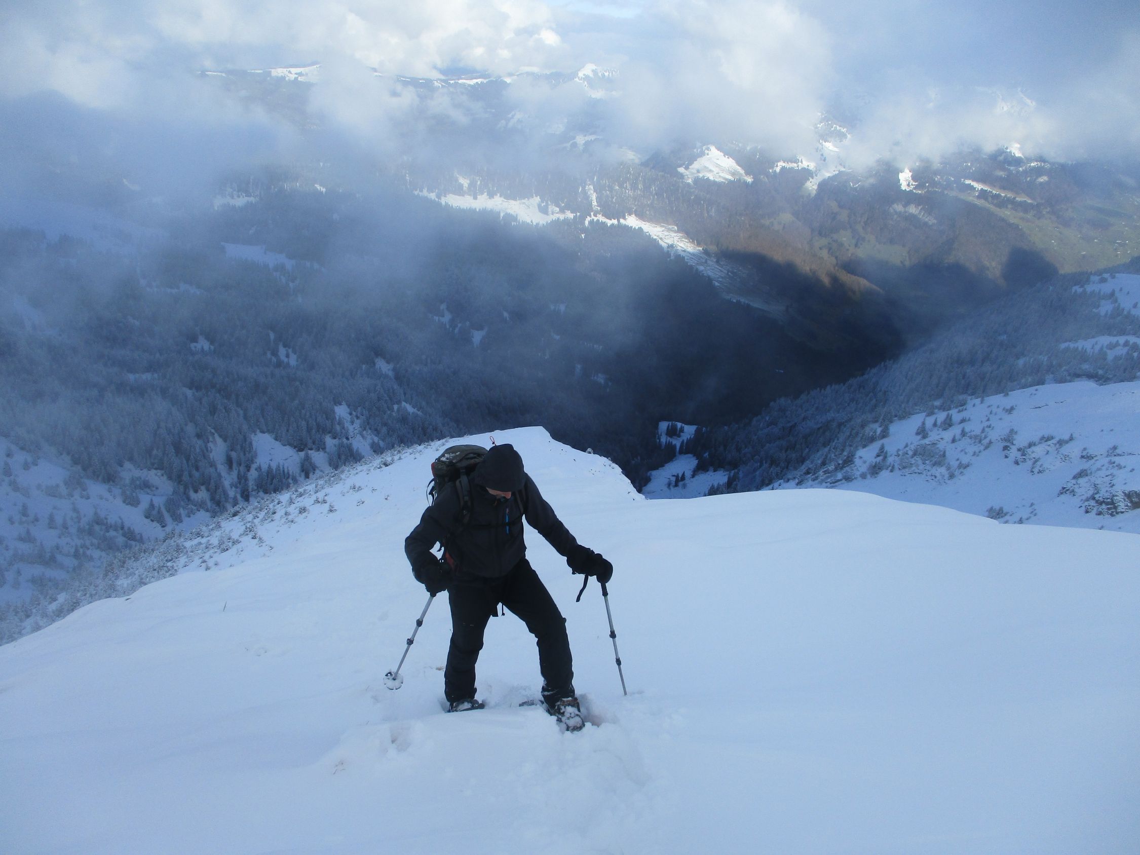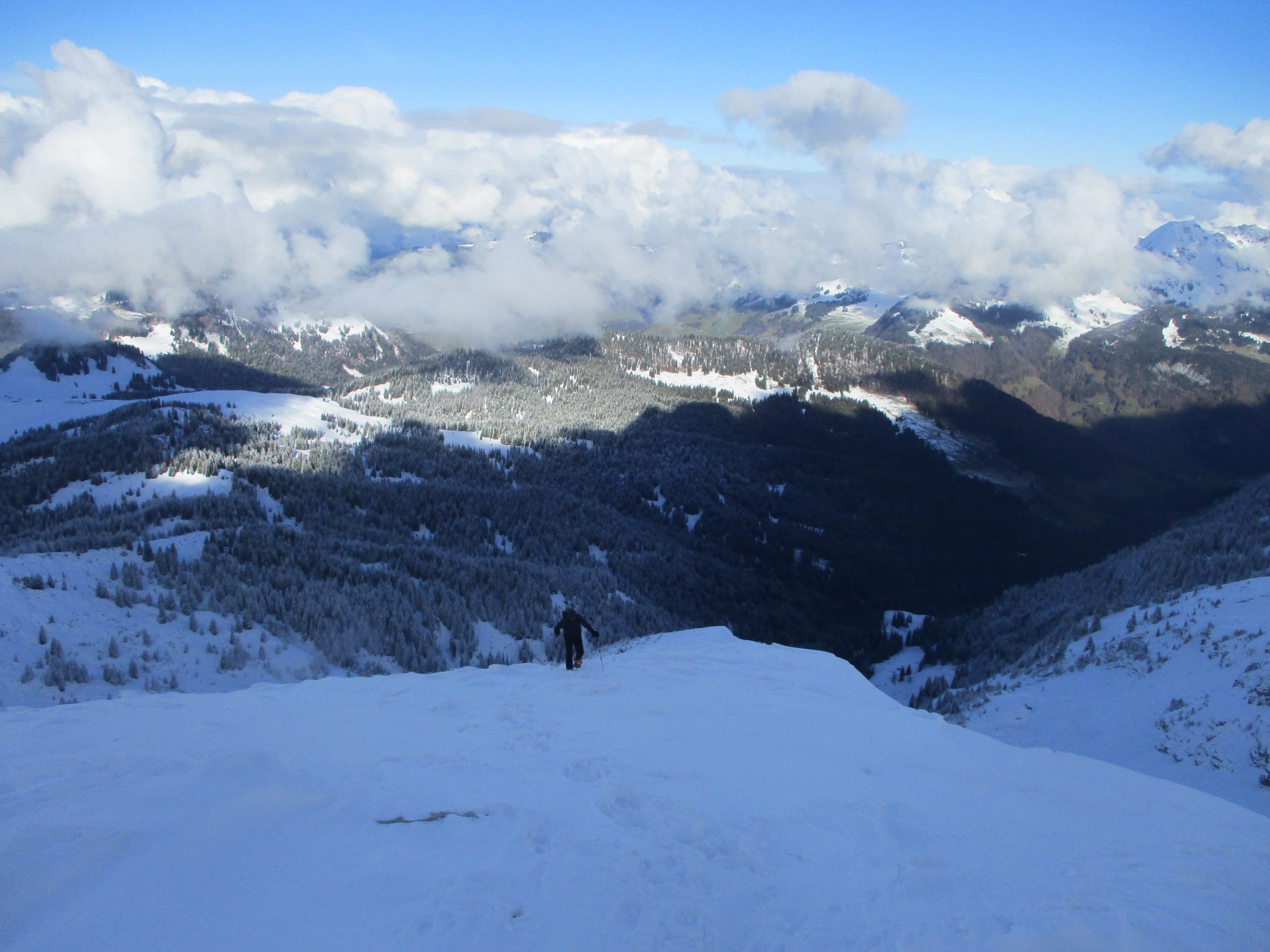 Nur wenig oberhalb von Arvenbüel konnten wir schon die Schneeschuhe anschnallen. In der Flanke und auf dem Grat bis zu 30 cm lockerer Pulver. Bis Alpe Looch sind wir einer Fußspur gefolgt, danach mühsame Spurarbeit bis zum Gipfel, der nach knapp 3 1/2 Std. erreicht war. Wir brauchten also gut eine Std. über Normal. Permanenter Grundkontakt. Mit Skiern somit derzeit nicht zu empfehlen, auch wegen der vielen nicht erkennbaren, eingeschneiten Felsen. Hinter uns folgten 3 weitere Tourengänger ohne Schneeschuhe.