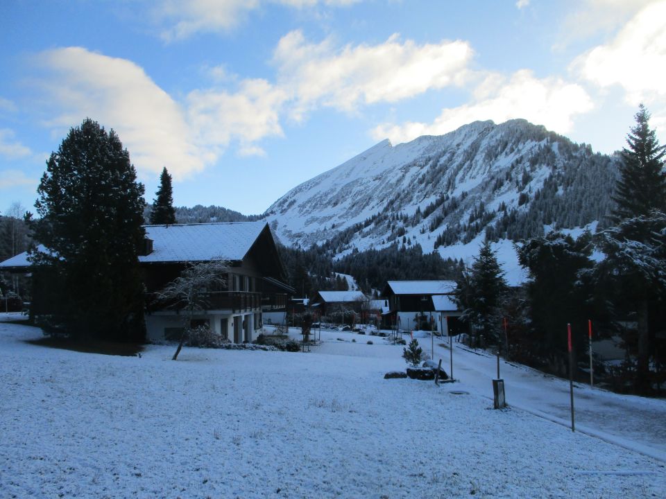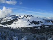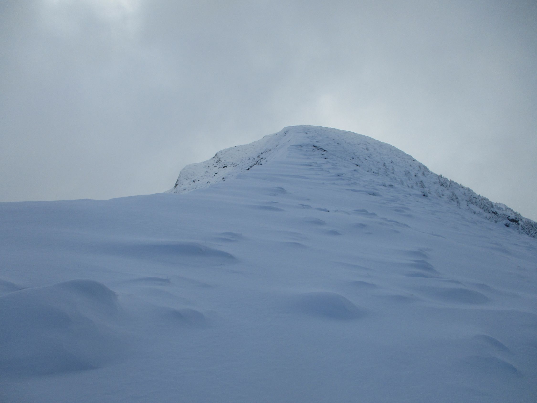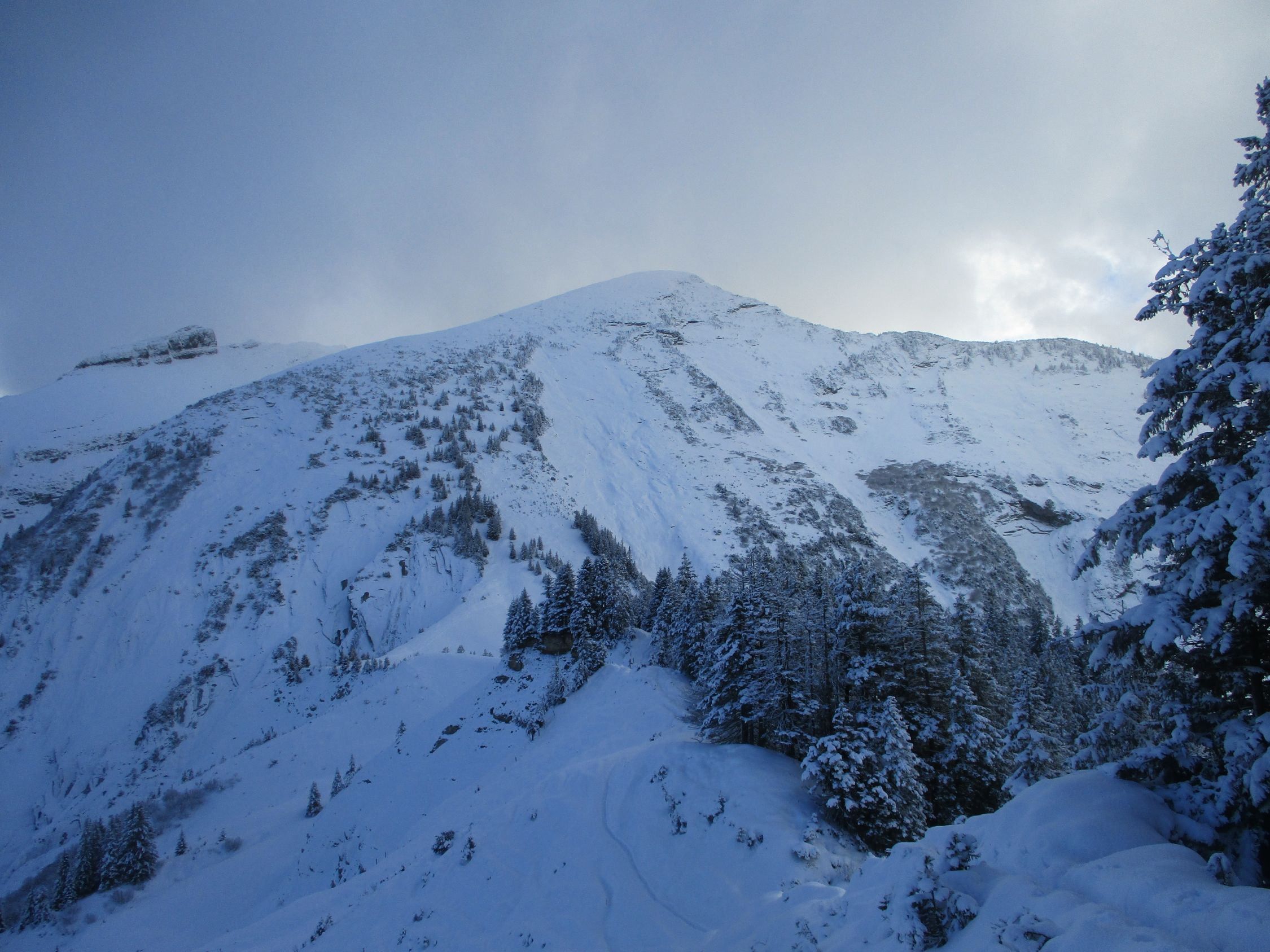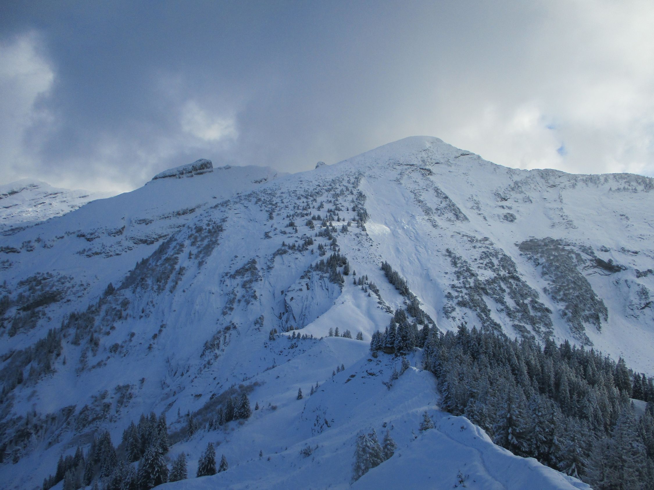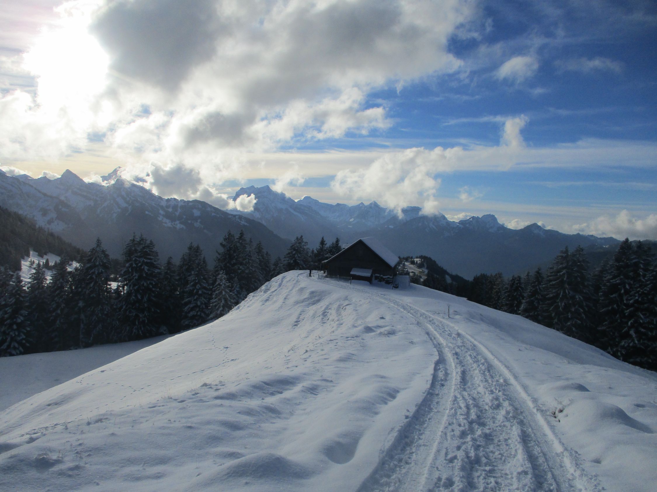 Nur wenig oberhalb von Arvenbüel konnten wir schon die Schneeschuhe anschnallen. In der Flanke und auf dem Grat bis zu 30 cm lockerer Pulver. Bis Alpe Looch sind wir einer Fußspur gefolgt, danach mühsame Spurarbeit bis zum Gipfel, der nach knapp 3 1/2 Std. erreicht war. Wir brauchten also gut eine Std. über Normal. Permanenter Grundkontakt. Mit Skiern somit derzeit nicht zu empfehlen, auch wegen der vielen nicht erkennbaren, eingeschneiten Felsen. Hinter uns folgten 3 weitere Tourengänger ohne Schneeschuhe.