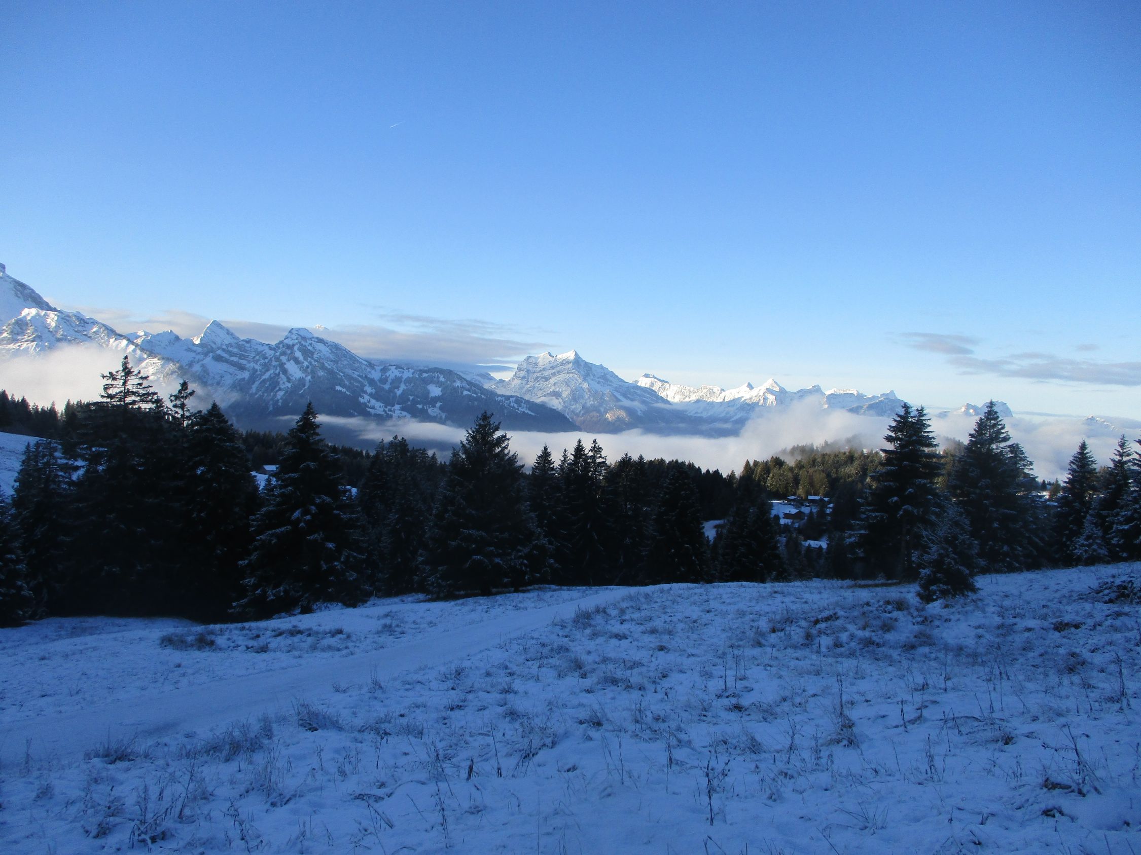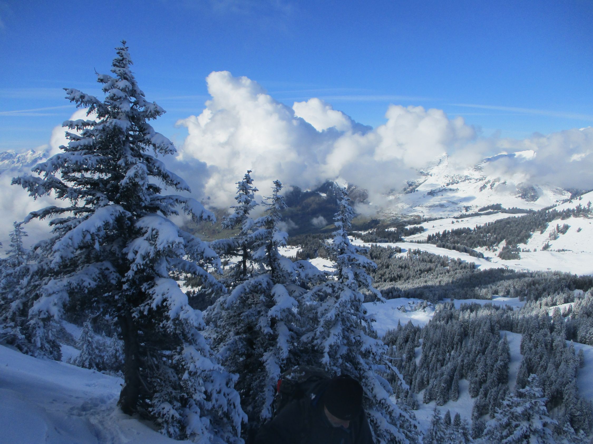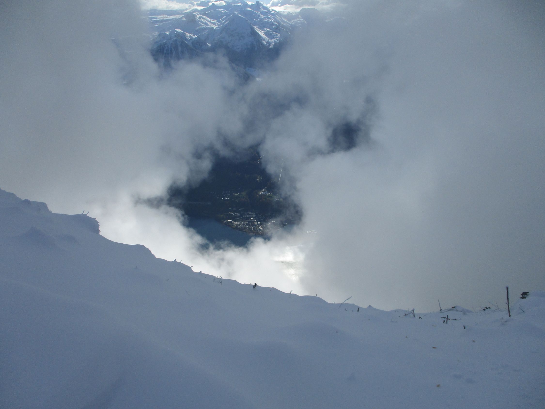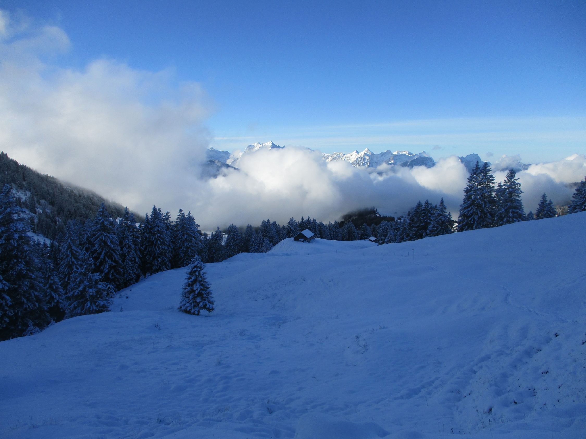 Nur wenig oberhalb von Arvenbüel konnten wir schon die Schneeschuhe anschnallen. In der Flanke und auf dem Grat bis zu 30 cm lockerer Pulver. Bis Alpe Looch sind wir einer Fußspur gefolgt, danach mühsame Spurarbeit bis zum Gipfel, der nach knapp 3 1/2 Std. erreicht war. Wir brauchten also gut eine Std. über Normal. Permanenter Grundkontakt. Mit Skiern somit derzeit nicht zu empfehlen, auch wegen der vielen nicht erkennbaren, eingeschneiten Felsen. Hinter uns folgten 3 weitere Tourengänger ohne Schneeschuhe.