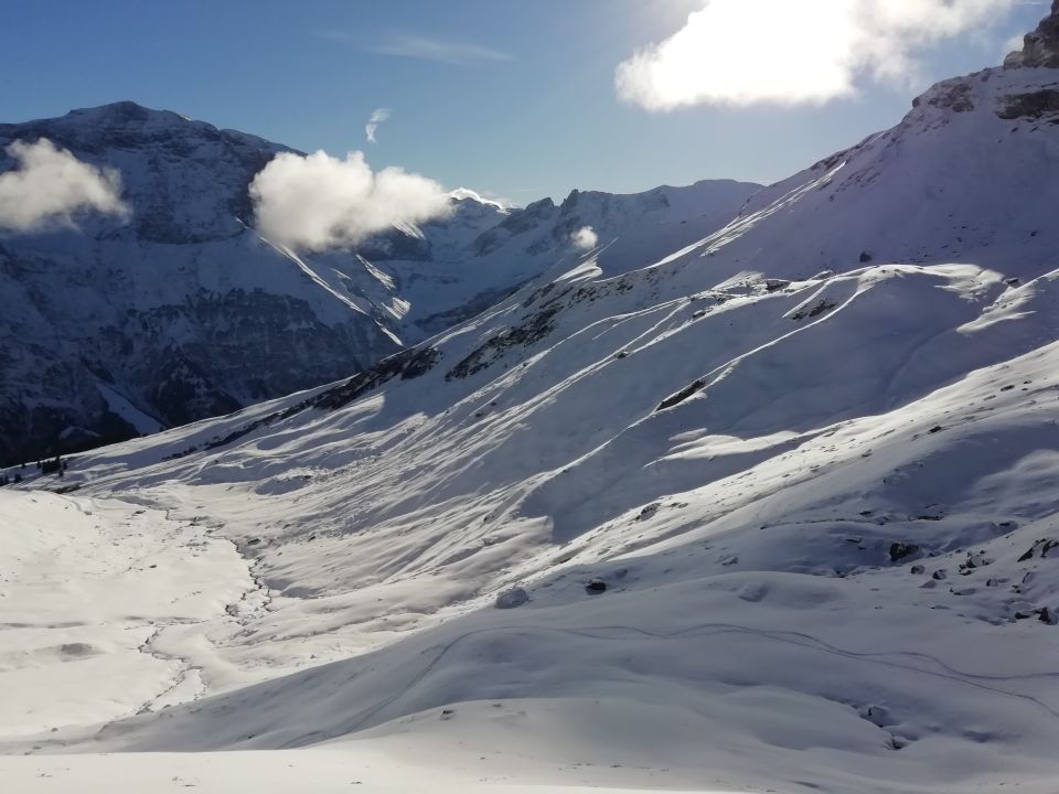 Wir haben nach einer Tour mit grasigem Untergrund gesucht und gefunden. Weil das Skigebiet noch nicht in Betrieb ist, hatten wir Ruhe. In Elm liegt noch kein Schnee, wir sind deshalb ab "Hinterhus" (hinter Steinibach, 100 Hm Ski getragen), und über Hängstboden und westl. vom Steinibach aufgestiegen. Ab etwa 1300m durchgehende Schneedecke. Schneehöhen: 1500m: 30cm, 1800 40cm, 2000m: 50cm. Wir sind dann durch die Gross Schluecht abgefahren. Gelegentlicher Steinkontakt ist nicht ganz vermeidbar, aber alles in allem recht ordentliche Verhältnisse.