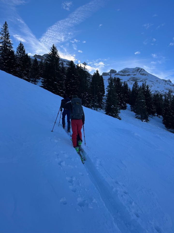 Aufgrund der eher knappen Schneelage den Schlussanstieg nicht wie üblich von der Nordseite angegangen, sondern von der Südseite durch die steile Mulde östlich des Twäriberg.