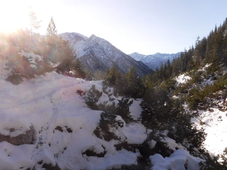 Tourenbeginn um 08:55 Uhr bei -7°C unter klarem Himmel. In oberer Sonne wurde es schnell bis auf 12°C wärmer. Im Tal lag kaum Schnee. Das änderte sich allerdings erheblich nach der Roggentalgabel. Auf dem Weitalpjoch lagen schon ca. 25 cm Neuschnee. In der NO-Flanke unterhalb vom Vorgipfel im NW-Grat war der Pulver dann knietief, wodurch man sich durch diesen durchwühlen musste. Es führte eine Spur hinauf bis zur 3. Querung des Bachgrabens. Dort endete sie und war darum auch gekennzeichnet von den Umkehrspuren. Von da ab spurte ich hinauf bis zum Gipfel. Benötigte allerdings die doppelte Zeit deswegen. Im Aufstieg überholte ich am Anfang 3 Berggänger. Unterwegs kamen mir die 3 Spurenleger zurück entgegen. Ich hielt deren Routenabweichung durch den Schnee und die nicht mehr sichtbare Route hinauf zum Joch für zu riskant. Insofern drehte ich bei deren Umkehrstelle ebenfalls um, setzte aber tiefer im Bachgrabenbereich neu an zum Aufstieg. Mehr, oder weniger der Logik des Geländes folgend. Also links vom oberen Bachgraben. Damit lag ich dann auf richtiger Sommerwegspur und kratzte sogar zwei alte rote Markierungen frei. Nach mir folgten dann die drei und 2 weitere hinauf bis zum Weitalpjoch. Dort fand ich lediglich nur Gamsspuren vor. Weder hier, noch bei der Roggentalgabel gab es Aufstiegsspuren von Berggängern zur Hochplatte. Während der gesamten Tour beobachtete ich auch keinen Berggänger zum / am Kreuz auf der Hochplatte.