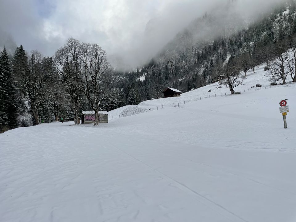Am PP Meniggrund gähnende Leere und 3cm Neuschnee. Erinnerte mich an den Flachwitz von Otto, dem deutschen Komiker meiner Jugend: „…und es lagen 8 Meter Schnee“ Publikum: Ooooh! Otto, spöttisch: „Nebeneinander, Mensch!“
