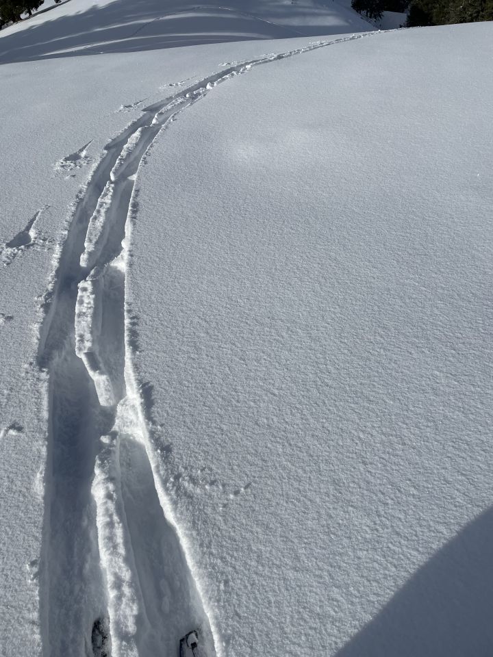Entschuldigung, ich schweife ab. Aufstieg mit Ski vom PP möglich, ab Brätliplatz sogar eine Unterlage vorhanden. Wetter zuerst noch wolkenverhangen, dann immer schöner. Aufstieg durch den Gipfelhang, oben angelangt begann es rasch zuzuziehen. Also Gipfelrast verschieben und schnell wieder runter, um noch mit freier Sicht abzufahren. Zu meinem freudigen Erstaunen schöner Pulver mit Unterlage ohne Feindberührung bis zum Brätliplatz. Danach der Alpstrasse nach Abfahrt mit grosser Vorsicht auf dem wenigen Schnee gerade so möglich mit wenigen Steinkontakten. Dabei noch einen zweiten Tourengänger getroffen, mehr waren wir heute nicht. Alles in allem um Welten besser als erwartet.