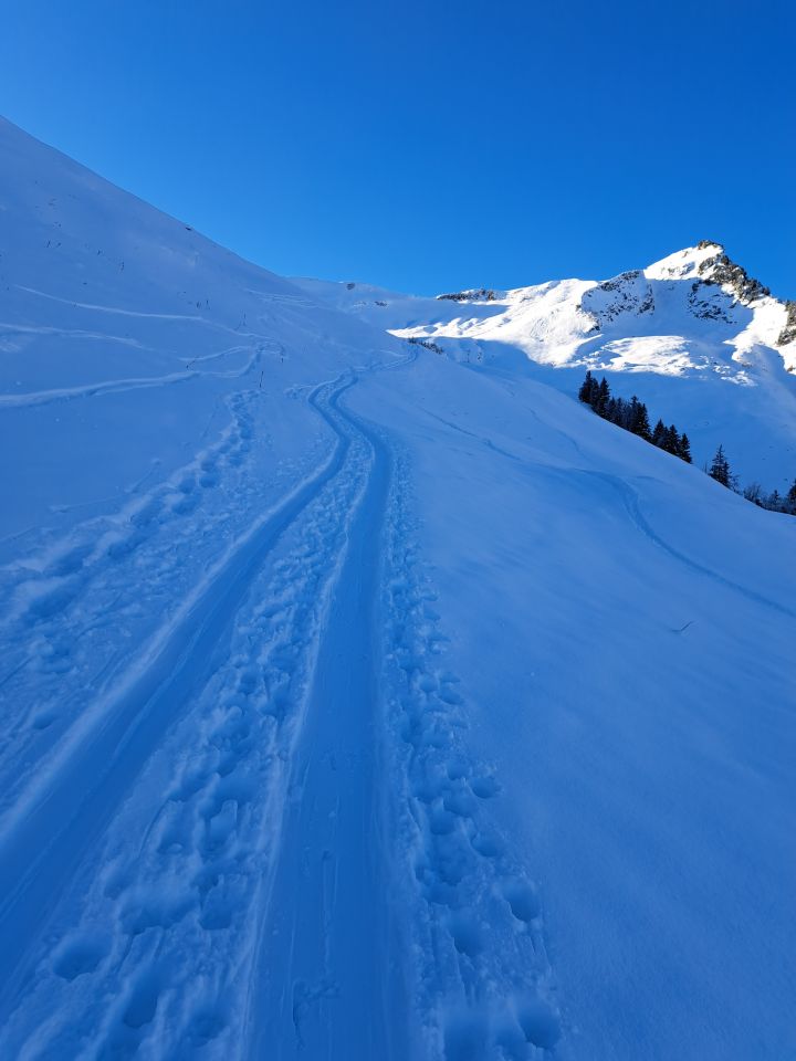 Wir sind weiter in guter Spur auf den Rot Turen. Abfahrt in Richtung Oberfeld. Im oberen Bereich Steinkontakt fast nicht vermeidbar. Weiter unten herrlicher Pulverschnee.