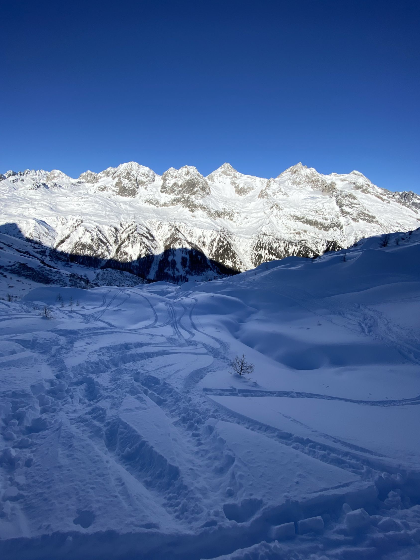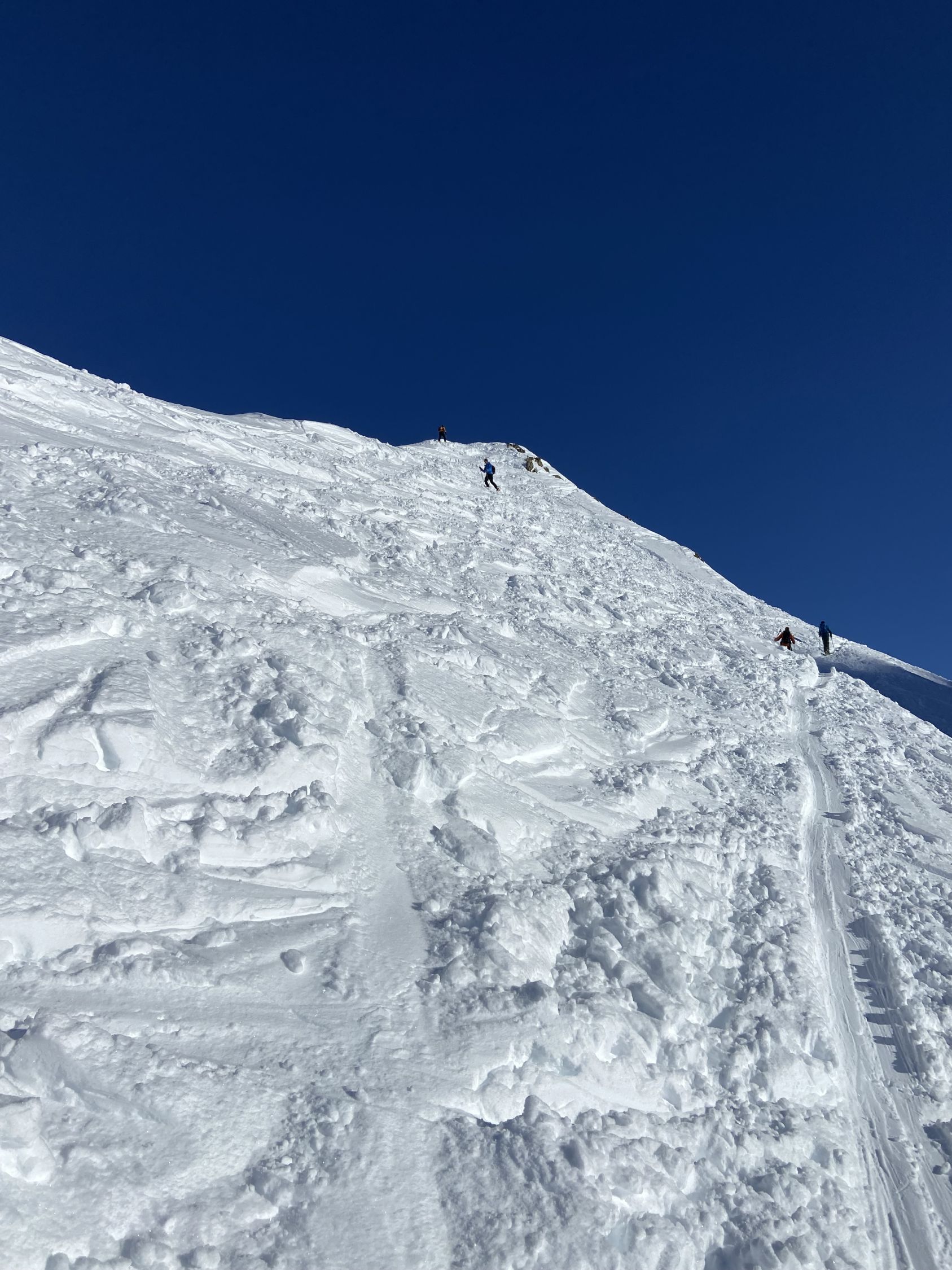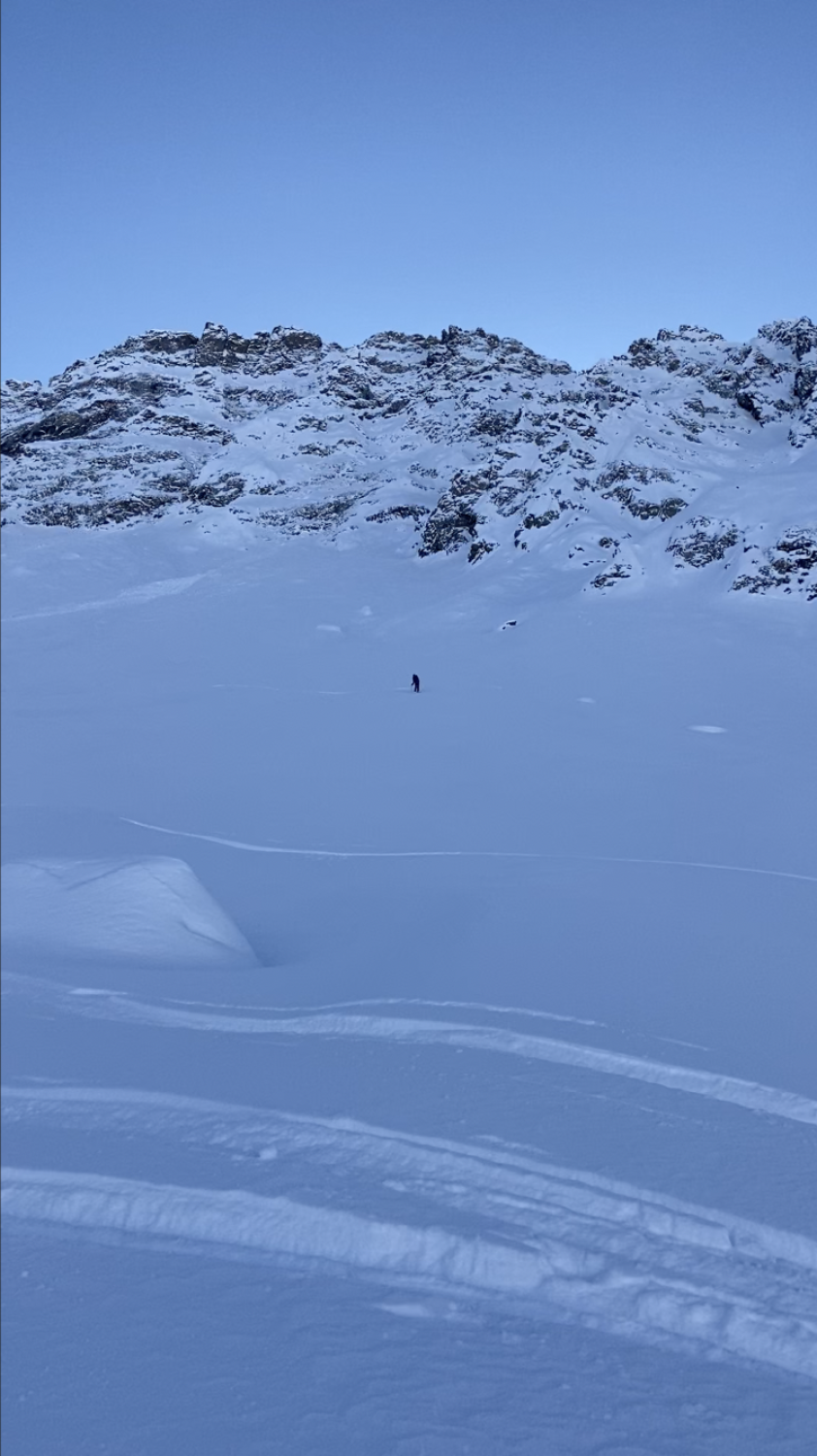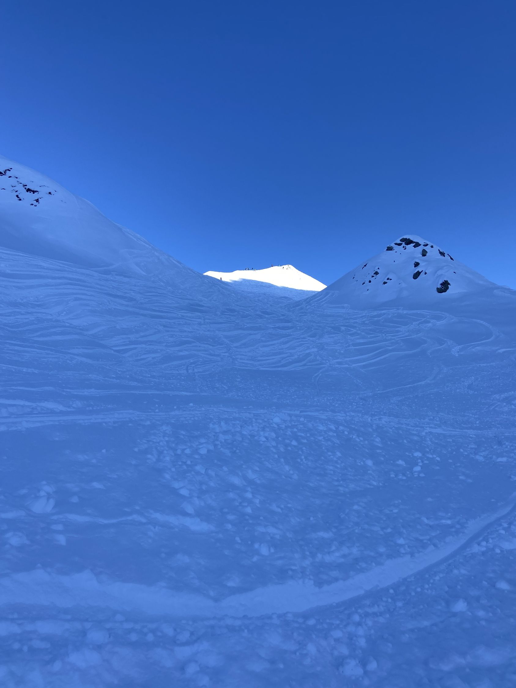 Die pulvrigen Hänge wurden heute zerfahren, das schadet aber der Schneequalität nicht. Sobald sich die erste Schicht setzt und Neuschnee dazukommt, werden die Bedingungen super sein.
