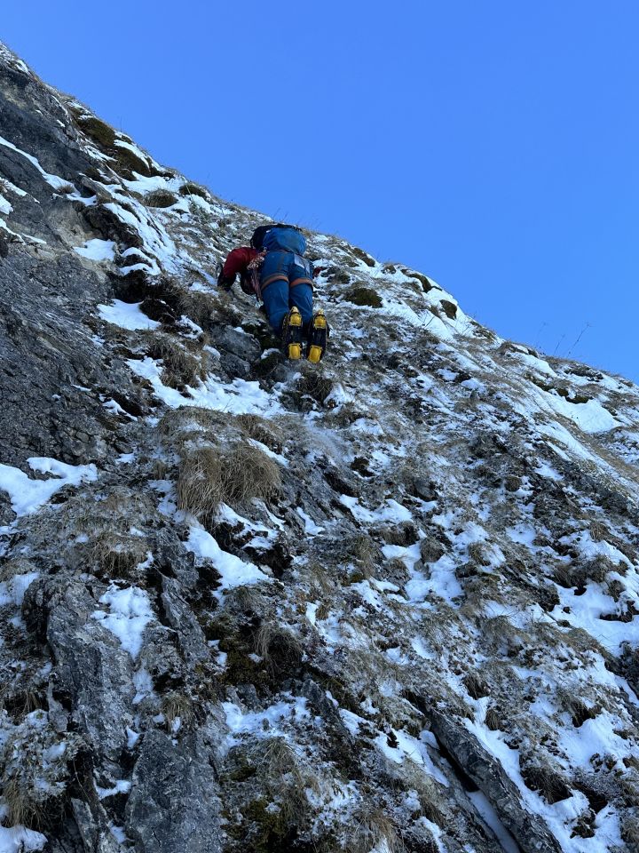 die Route ist mit Bohrhaken gut abgesichert. Steil und grasig. Die 2. SL bis 75 Grad steil.