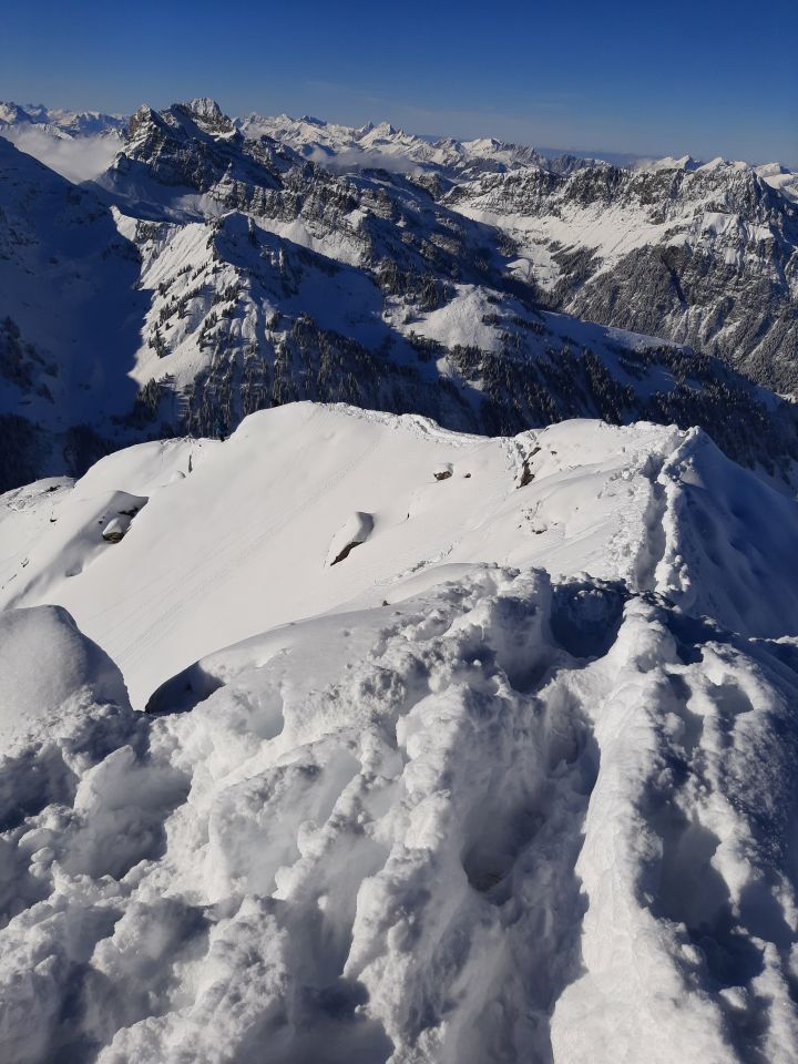 Unten hat es ca. 25-30cm ab 2000müM ca. 30-40cm Neuschnee. Sonnseitig wird dieser rasch schwer werden.