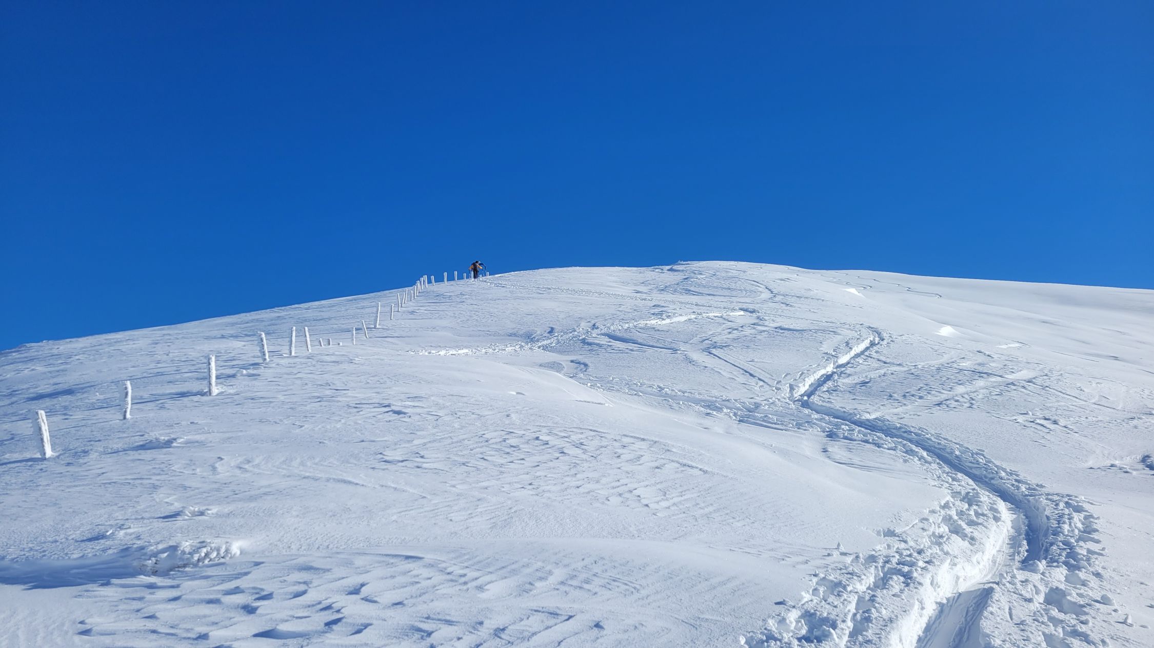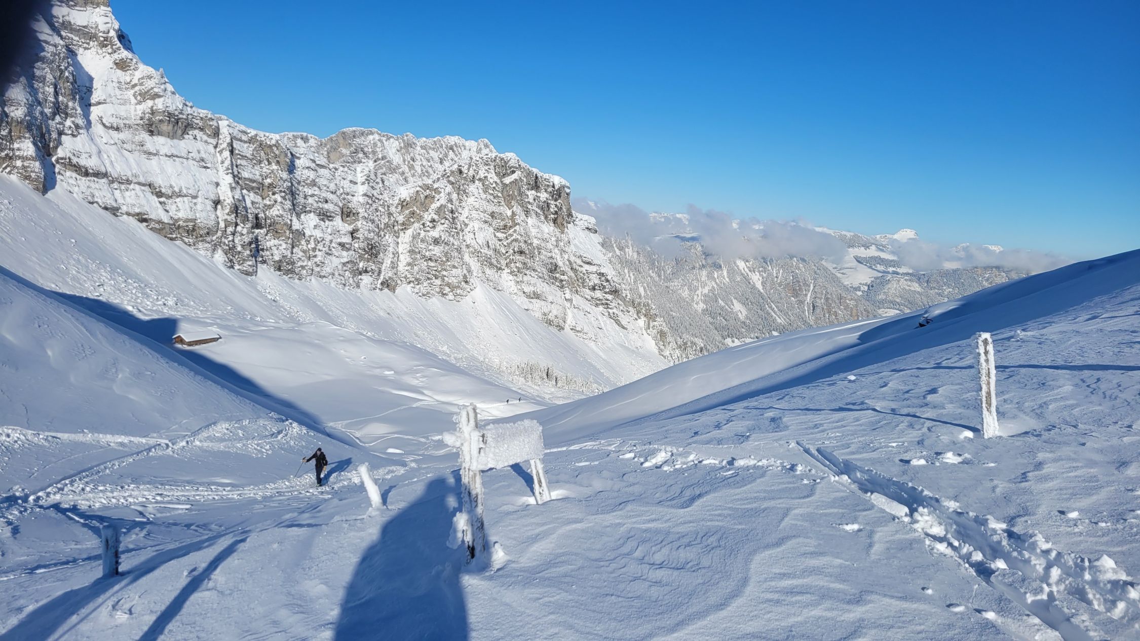 Besser als erwartet, z.t. bis zu 40 cm lockerer Pulverschnee, kaum oder gar nicht windbearbeitet. Leider fast durchgehend bis auf den Boden, deshalb konnte man nicht ganz so entspannt powdern, wie man wollte. Letzlich aber auf der ganzen Tour kein Steinkontakt. Auch die Strasse/ der Weg im Wald war gut eingeschneit. Auf dem Gipfelrücken erstaunlicherweise kaum Windzeichen, weshalb das auch fast die schönste Abfahrt war. Oben z.T. 40 cm Powder. Kein Steinkontakt. In der Nordflanke waren noch keine Spuren. Wir haben uns auch noch nicht getraut, wegen der möglichen Steinkontakte, aber eigentlich sollte es mit etwas vorsicht, zumindest im flacheren Teil möglich sein.