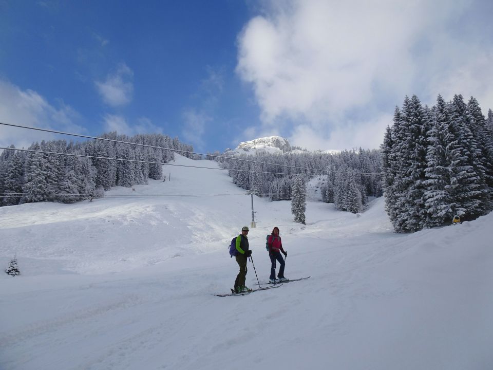 Schöner Pulver, oben bis 30 cm; Pisten vorbereitet, aber noch nicht gewalzt. Im Gipfelhang Vorsicht auf Steine, im unteren Bereich viele Eisbollen, die am Pistenrand aber gut umfahren werden können. Abfahrt insgesamt durchaus lohnend.
