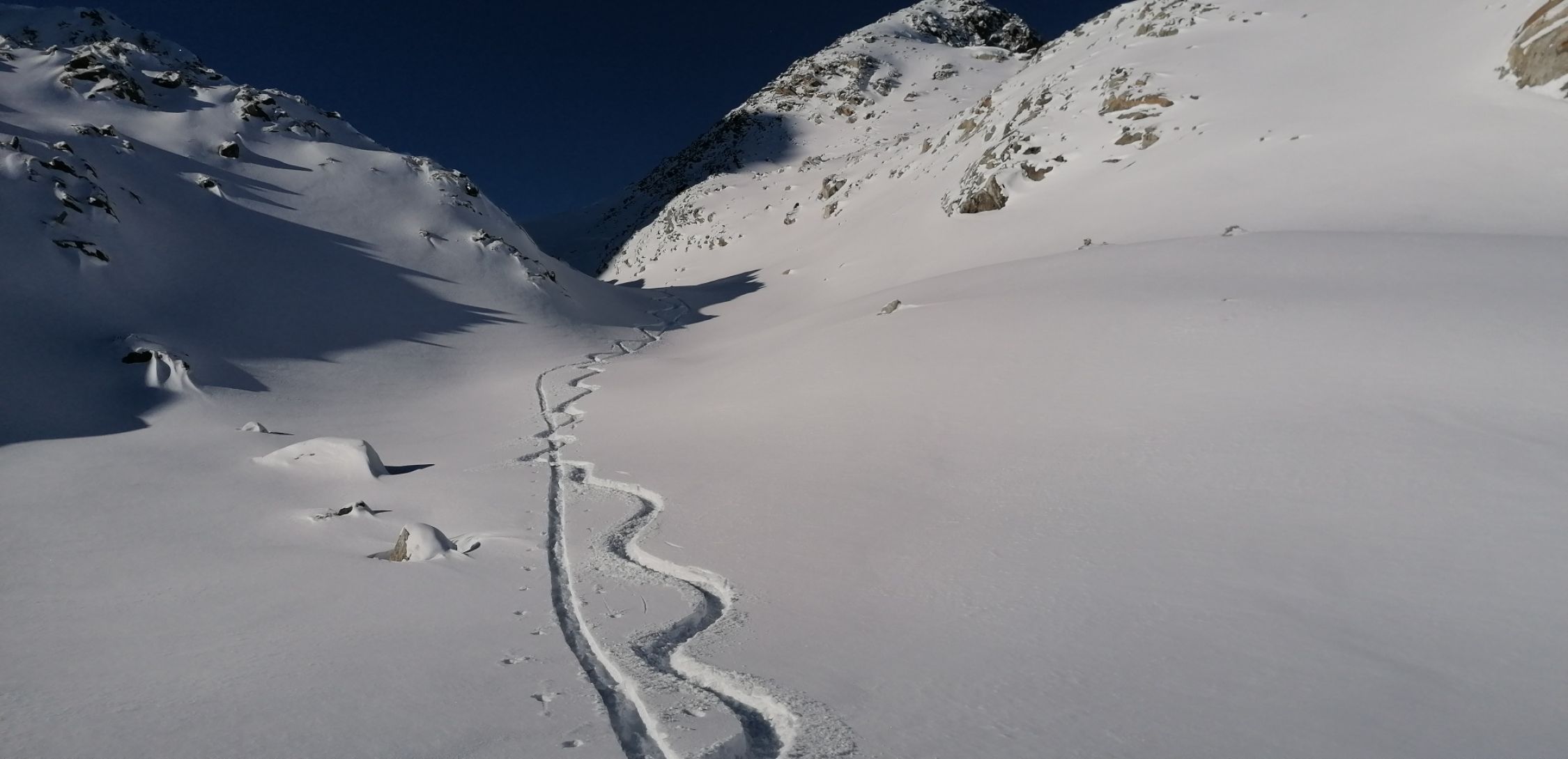Gewalzte Strasse bis zur Brücke Ebnen . Das Witenwasserental ist bis Oberstafel vom Wind bearbeitet und bis zum Läckipass liegt in den Mulden tiefer Pulverschnee. An Graten wenig bis kein Schnee... Steinkontakte sind gut möglich