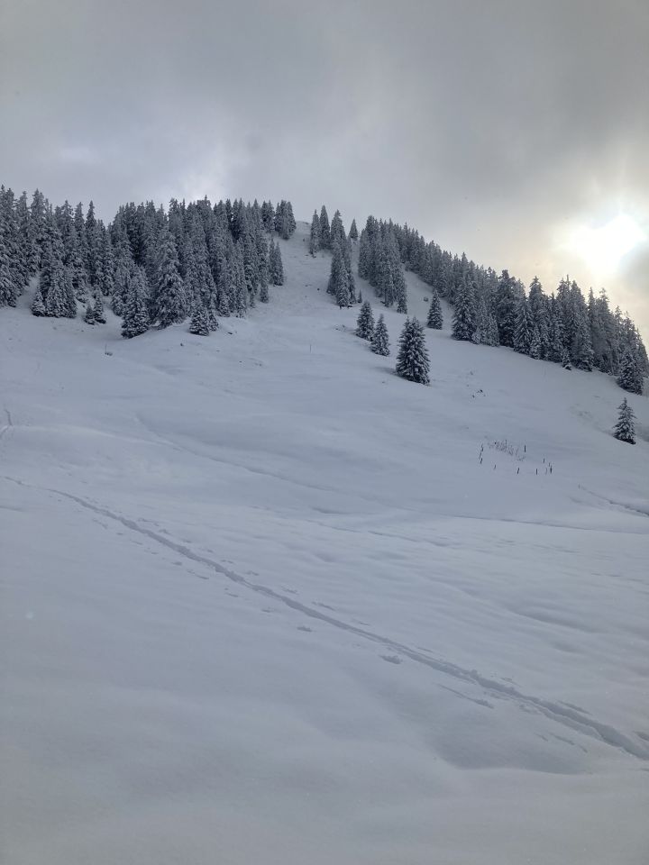 Nordwestflanke des Gipfels ruppig und durch das viele Abrutschen teils mit Gras durchsetzt. Kein Genuss und nicht ganz einfach zu fahren. Mit etwas Umsicht lässt sich Steinkontakt aber vermeiden. Engnis oberhalb der Wetterstation ist schon stark ausgefahren, aber mit Vorsicht kommt man auch hier ohne Schaden durch. Schwieriger ist die letzte Engstelle kurz vor dem Auslaufen. Mit neuen Ski allenfalls die letzte Lichtung auslassen und auf der Zwäckenstrasse abfahren.