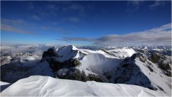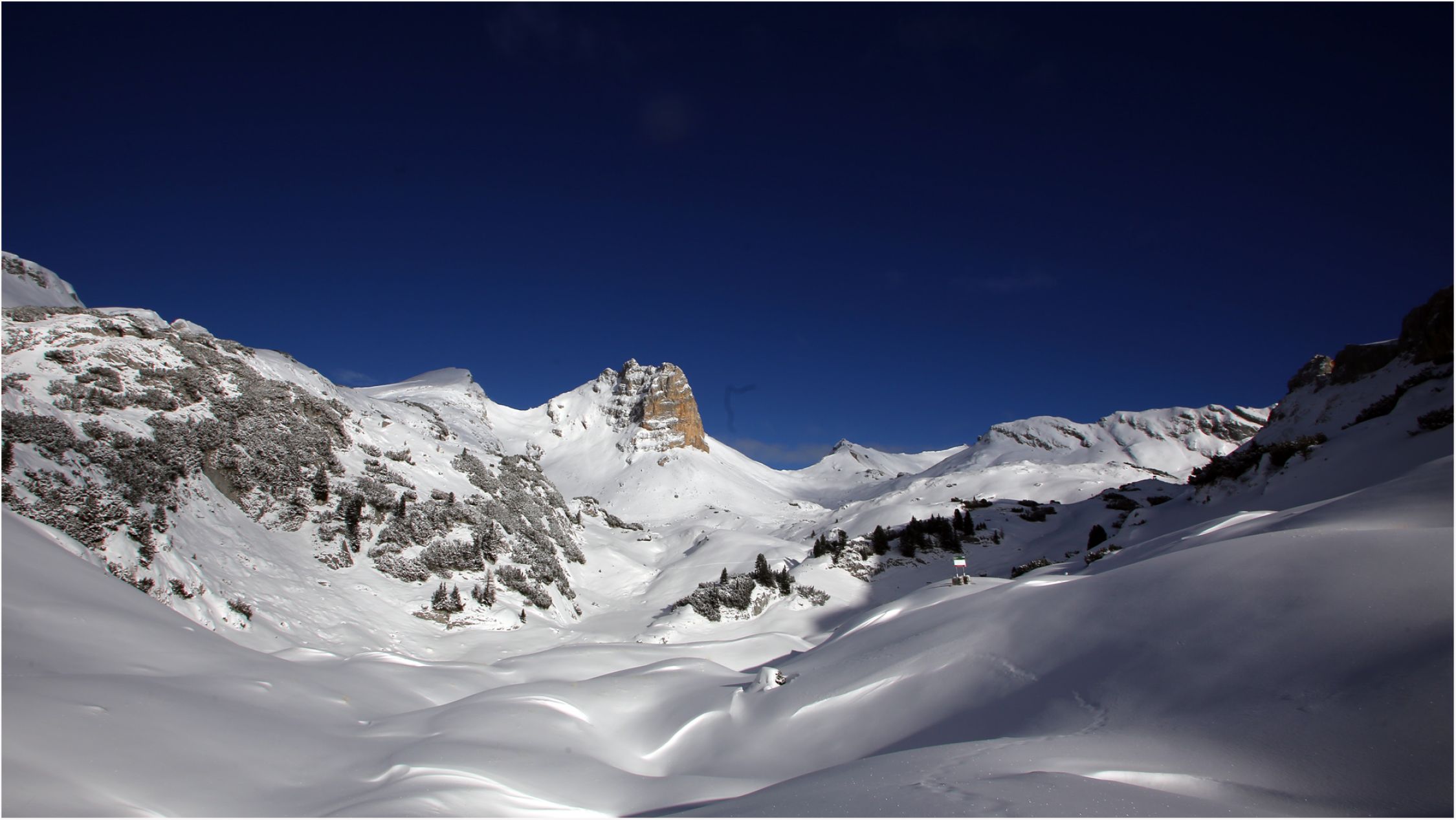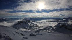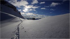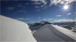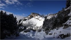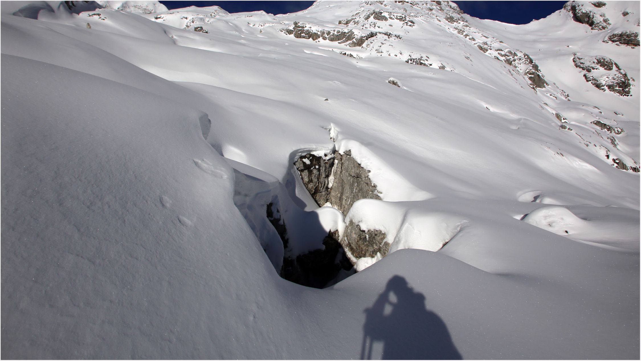 Ab Bergstation dann relativ viel Neuschnee, dafür nur eine mehlige Unterlage, durch welche man immer wieder durchbricht und auf den Steinen bzw in den Latschen steht. Insgesamt bis auf die letzten 50 HM durchweg grundloser und unberechenbar zur spurender Schnee. Dazu kommt, daß Dolinen und Löcher nur oberflächlich zugeweht sind, umsichtige Spuranlage durchaus notwendig, dennoch, man geht leicht verloren in den tiefen Löchern. Zwischendurch schaut es aus wie auf einem schlecht verschneiten Gletscher. Abfahrt mehrheitlich in der Aufstiegsspur um nicht ständig auf irgendeinem Felsen einzukratern. Lediglich oben gingen ein paar gute Schwünge.