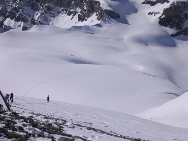 Sehr gute Verhältnisse auf der ganzen Tour. Bestehende Aufstiegsspuren nicht sehr ökonomisch. Oft Pulver, unten angesulzt. Am Gipfel kurzes Stück zu Fuss. Gipfel-Wächte!!!