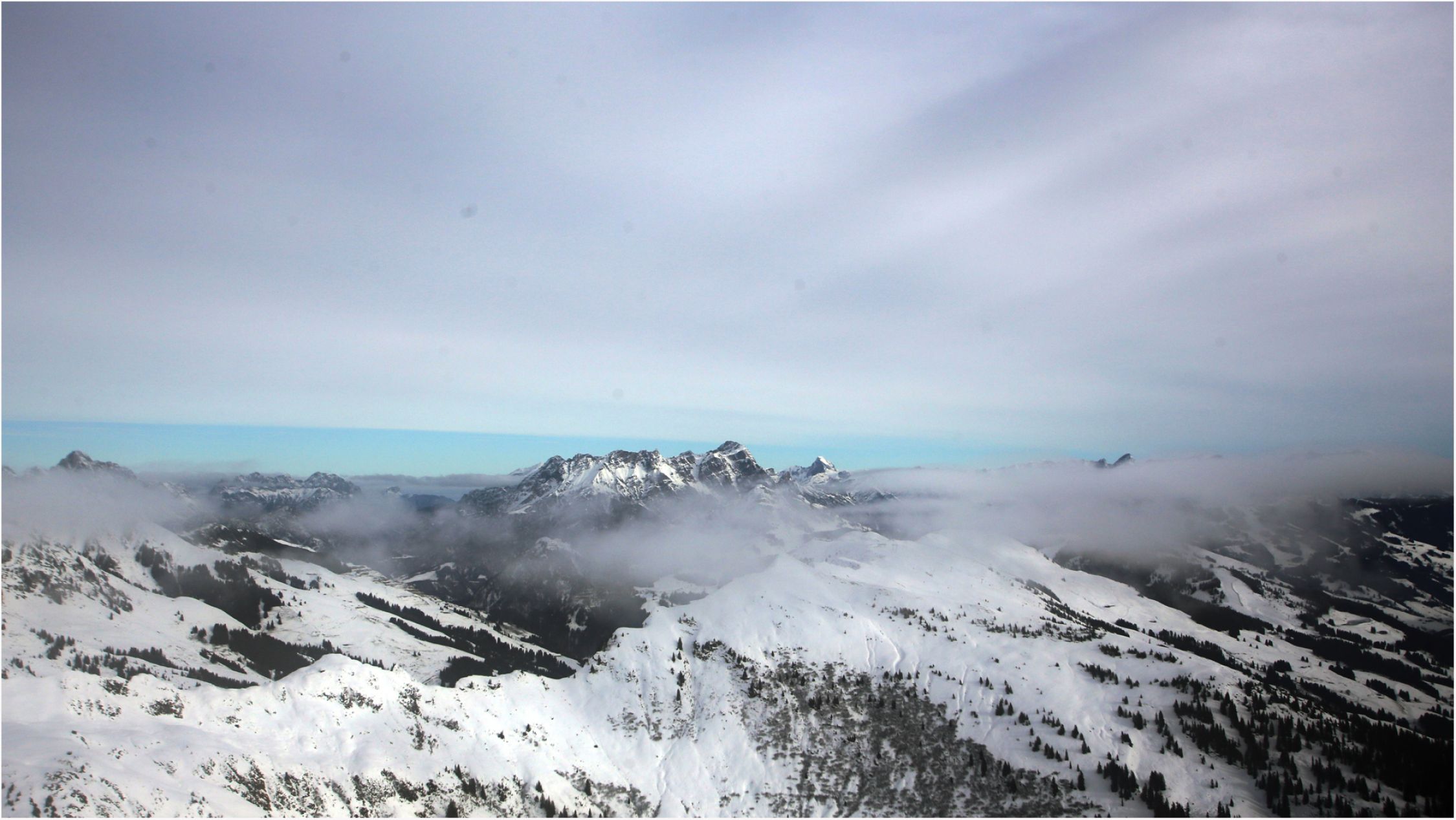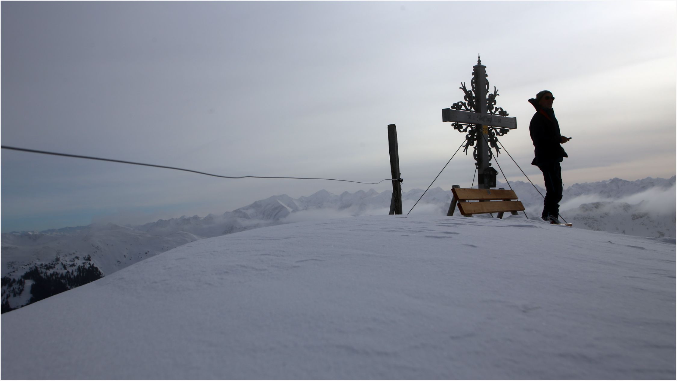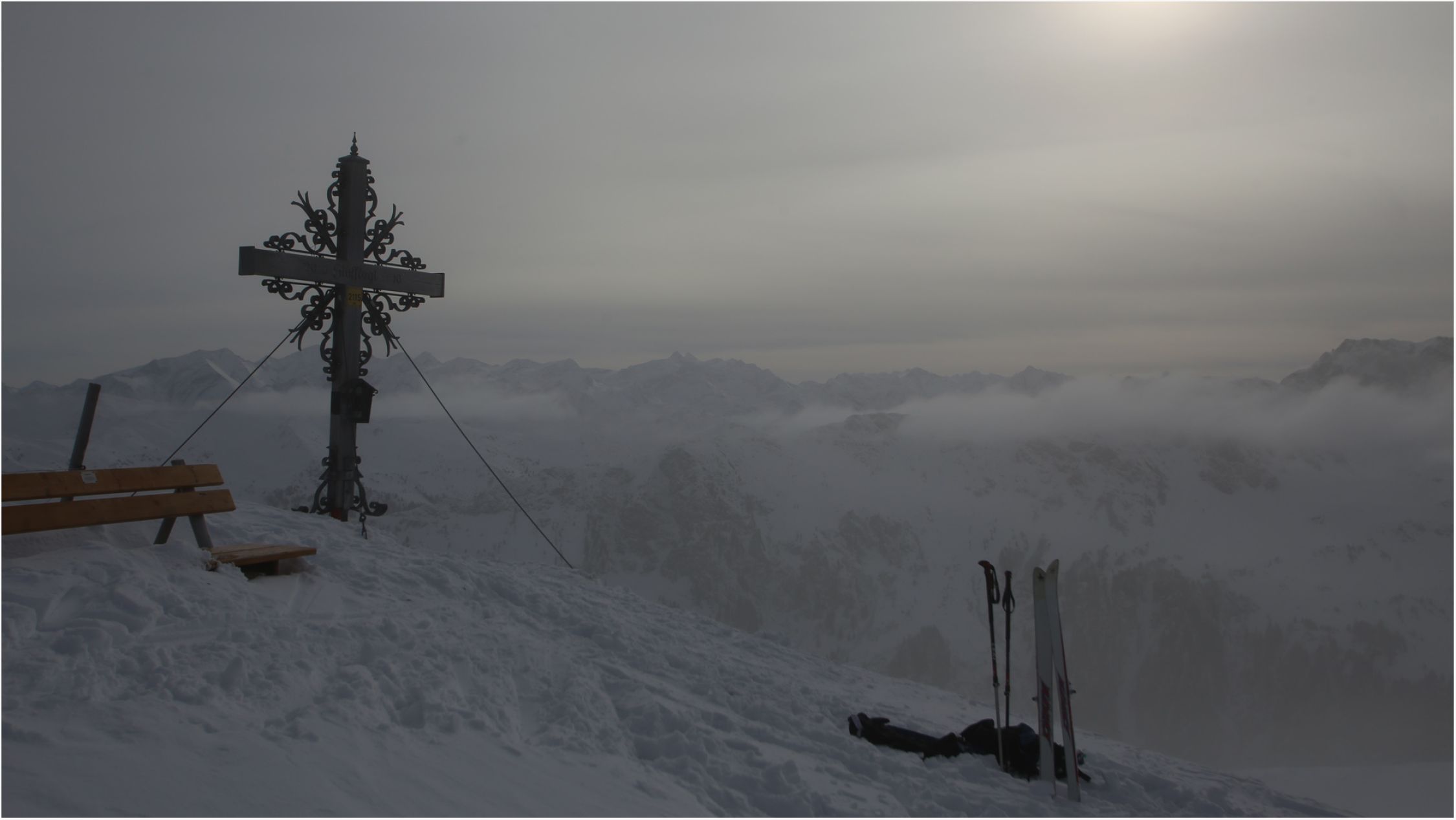 Blick in die Runde: Wie in den letzten Tagen bereits mehrfach erwähnt liegt rundherum zuwenig Schnee. Allerdings ist die Gesamtschneemege besser wie z. B. im Rofan und reicht auf alle Fälle aus, um auf den zahlreichen Forstwegen ohne Felsberührung runterzukommen.