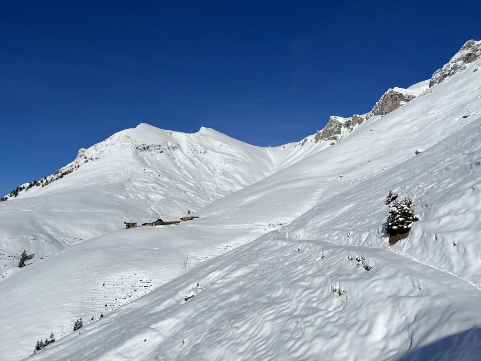 Schnee von unten bis oben. Schneeschuhe sinnvoll ab ca. 1400 m. Im oberen Teil anstrengende Spurarbeit, weil die Unterlage fast nie hielt. Alles unverspurt bisher. Einige Spuren von Eiskletterern an der Breitwangflue.,
