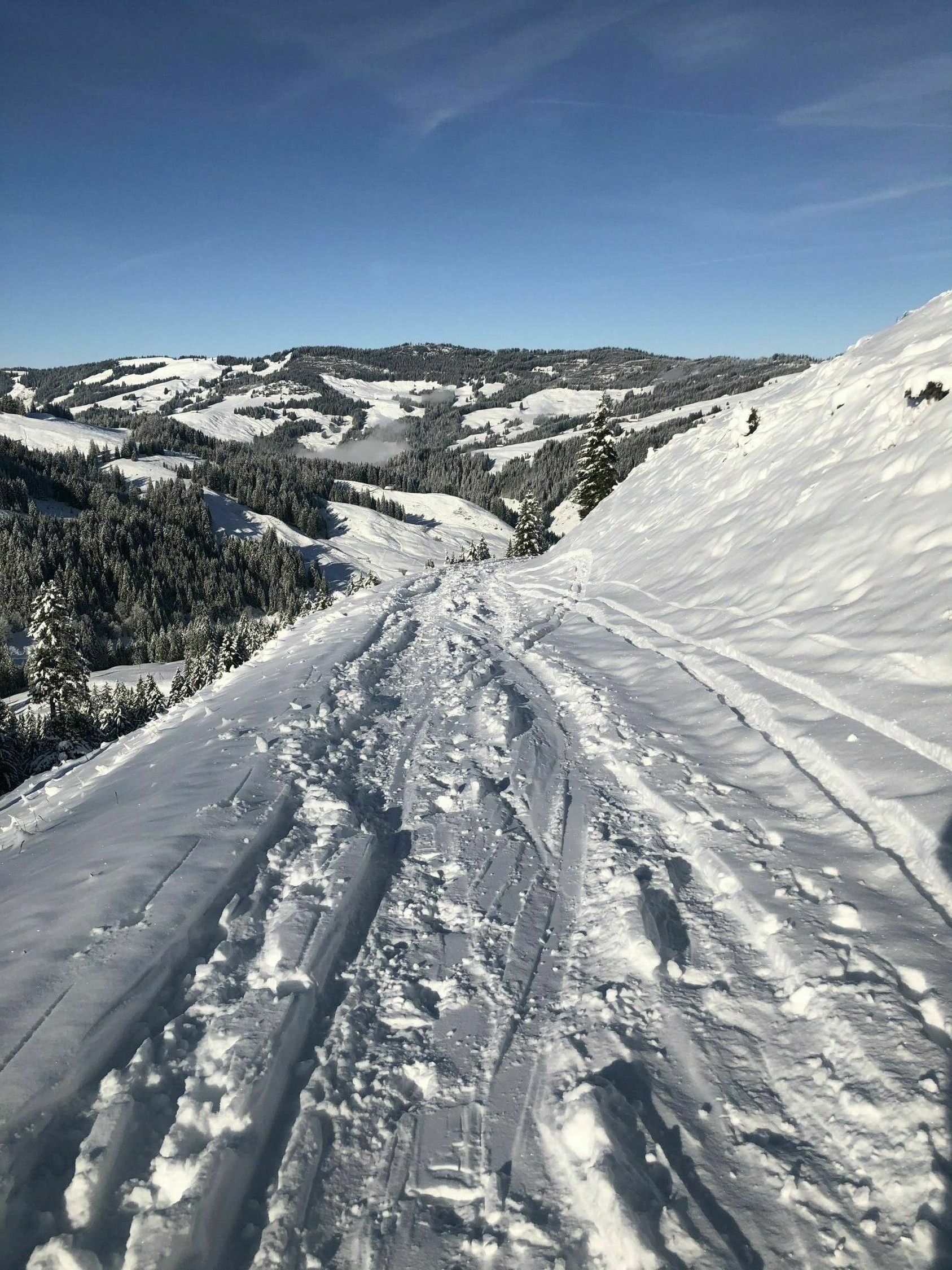 Ab Sangernboden über dem Nebel und Kaiserwetter. Ab Hengstkurve reicht der Schnee für den Aufstieg bis auf das Teersträsschen. Ab Schwendli 1500 ca. 15cm auf nicht solider Unterlage, aber rasch wird der Optimismus bestätigt und ab ca. 1650 ist's dann definitiv ein Traum: 20cm Pulver auf genügend Unterlage. Aufstieg bis Skidepot sehr passend. Ab Skidepot gute Spur für Fussaufstieg zum Gipfel.