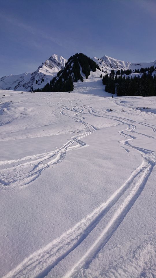 Am Gipfelhang wenig Unterlage. Nur ca. 15 cm Neuschnee. Recht knapp.