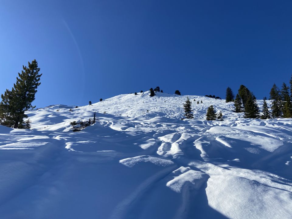 Pulver von oben bis unten; im Waldabschnitt musste man etwas aufpassen, dass man keinen Bodenkontakt hat, ansonsten gut zu fahren. Besonders in den Mulden guter Schnee, die ganz steilen Hänge haben wir aufgrund von Shark-Gefahr ausgelassen.