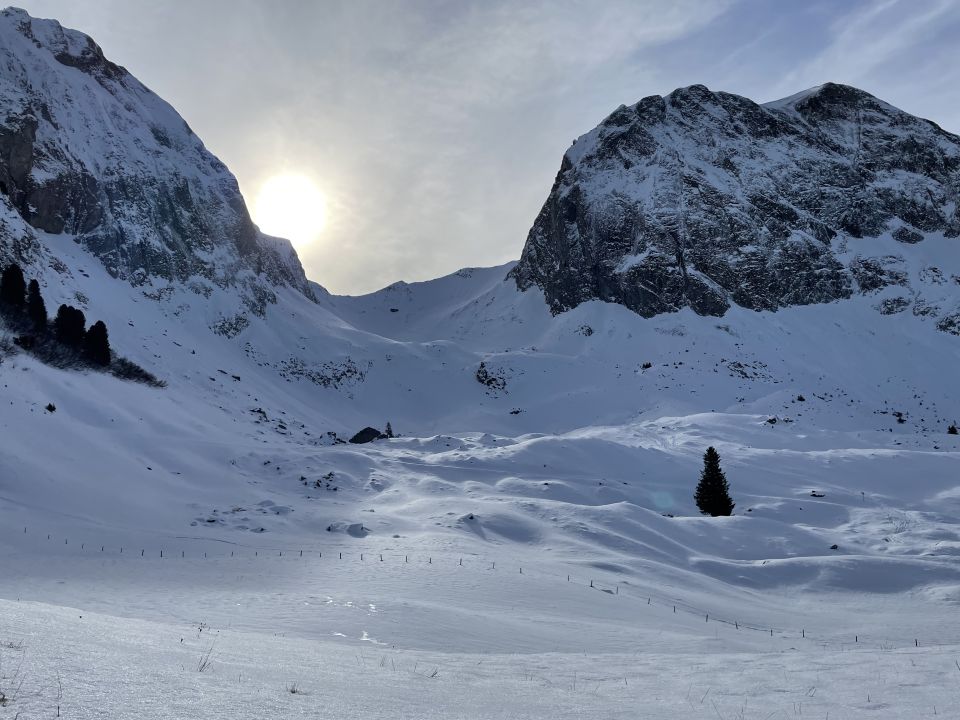 Der Schnee ist immer noch gut (Pulver)! Inzwischen halt gut verfahren und noch nicht so viel aber trotzdem eine gelungene Tour. Beim Abfahrt durch den Wald auf Steine achten! Der Skilift lief heute noch nicht. Habe nochmal angefellt und bin via Wanderweg Berghaus Gurnigel, dann auf den Schneeschuhweg zurück zum Wasserscheide Parkplatz.