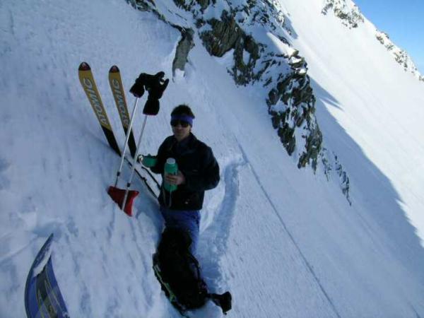 Abfahrt vom Skidepot über die Aufstiegsroute, zuerst über den Gletscher hinunter, etwas harstiger aber noch fahrbarer Pulver. Dann Schnee in allen Formen angetroffen, von miesem Brucharst bis totalem Nasschnee.