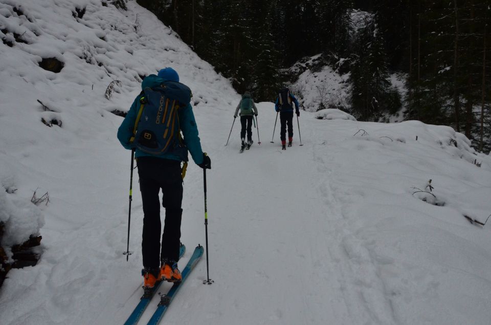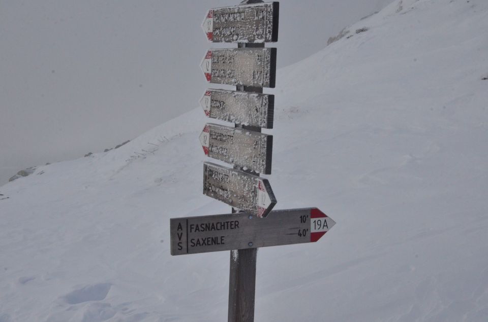 Für den Aufstieg ist genügend Schnee vorhanden. Für die Abfahrt im freien Gelände zu wenig. Es trügt sehr. Man möchte meinen, es sei viel Schnee vorhanden, aber dann kommt man immer wieder mit Steinen in Kontakt. Wir sind über die Pist abgefahren.
