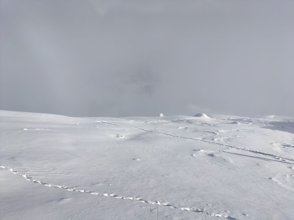 Start der Tour am 9 .15 Uhr, noch immer leichter Schneefall, die Ski konnten schon bald montiert werden , es hat durchwegs eine knappe Unterlage, der Anfangsteil aber sehr ruppig , der Neuschnee hielt sich in Grenzen mit 2- 20 cm Pulver, oben dann sehr gute Verhältnisse angetroffen , Entlang des Grates schon Windverblasen, bei der Abfahrt kein Steinkontakt heute, das war schon ein kleiner Erfolg.