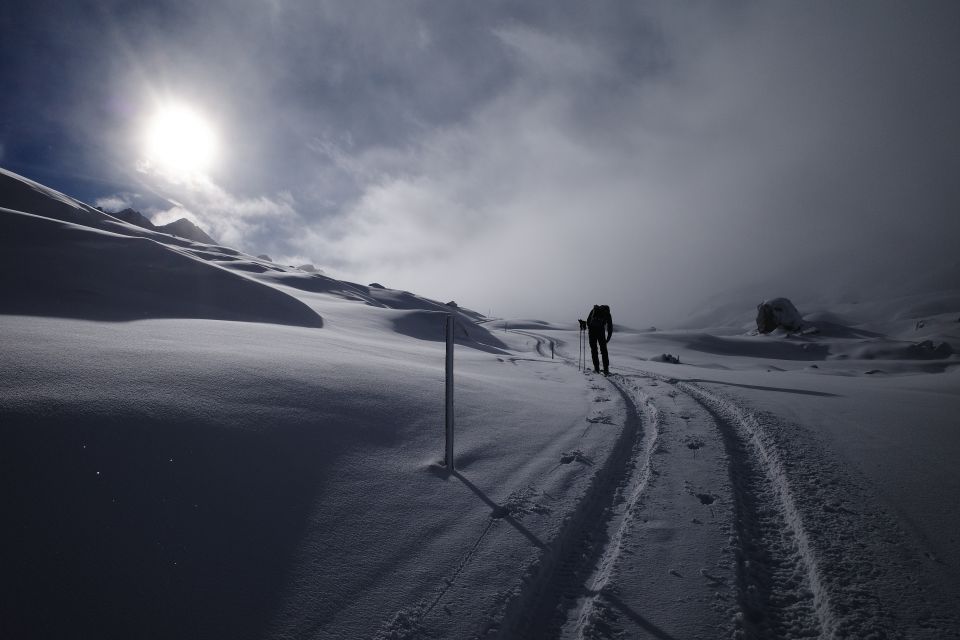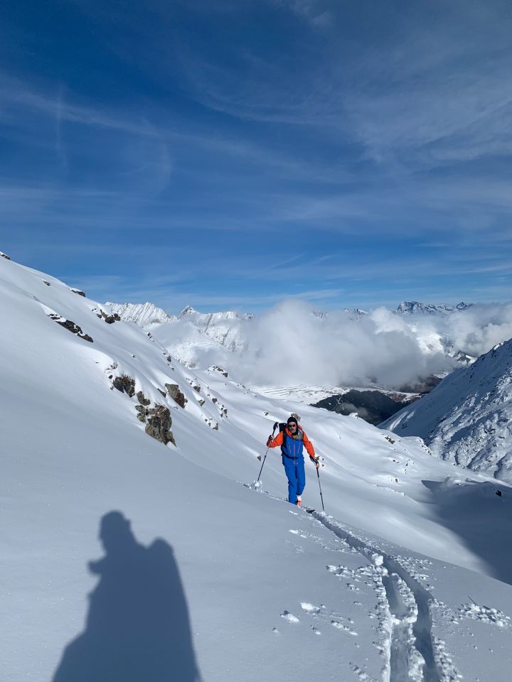 Aufsteig: Mit dem Zug ab Tschamutt 8:43 auf den Oberalppass. Dann Abfahrt auf der Passstrasse bis Surpalits, dank 10cm Neuschnee befahrbar. Ab Surpalits bis Maighelshütte problemlos der Strasse folgend, in den Hängen hat es noch zu wenig Schnee. Die Sonne hat uns knapp vor der Maighelshütte begrüsst. Ab Maighelshütte dann harte Spurarbeit im teils 35 cm tiefen Powder mit guter Unterlage bis zum Badus. 2-3 Wummgeräusche wurden wahrgenommen, somit ist die prognostizierte Lawinenstufe 3= zutreffend. Vom Skidepot dem Grat entlang im teils hüfttiefen Schnee. Der letzte Übergang zum Gipfel war uns dann trotzdem zu heikel, somit haben wir etwa 10m unter dem Gipfel gekehrt.