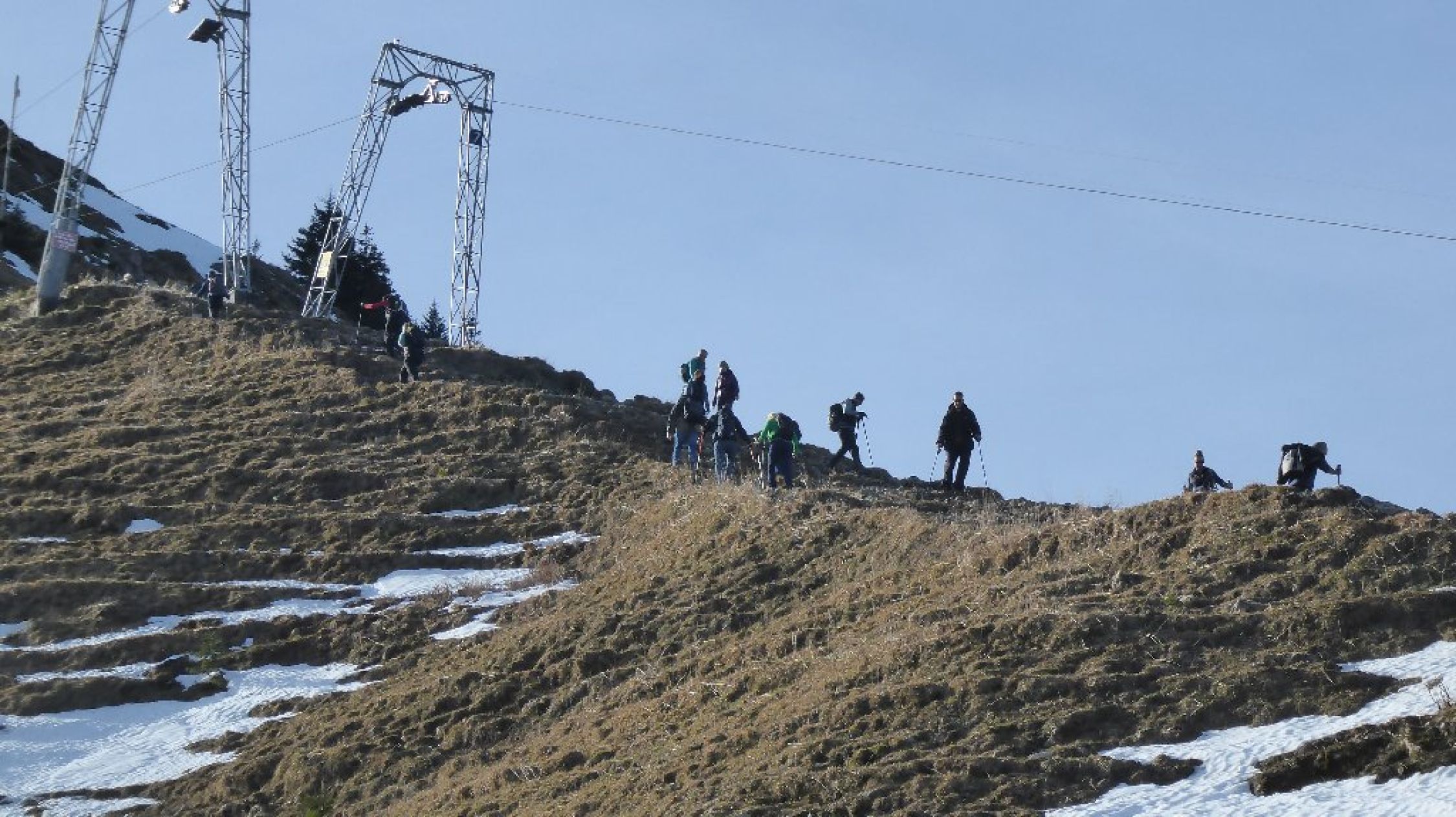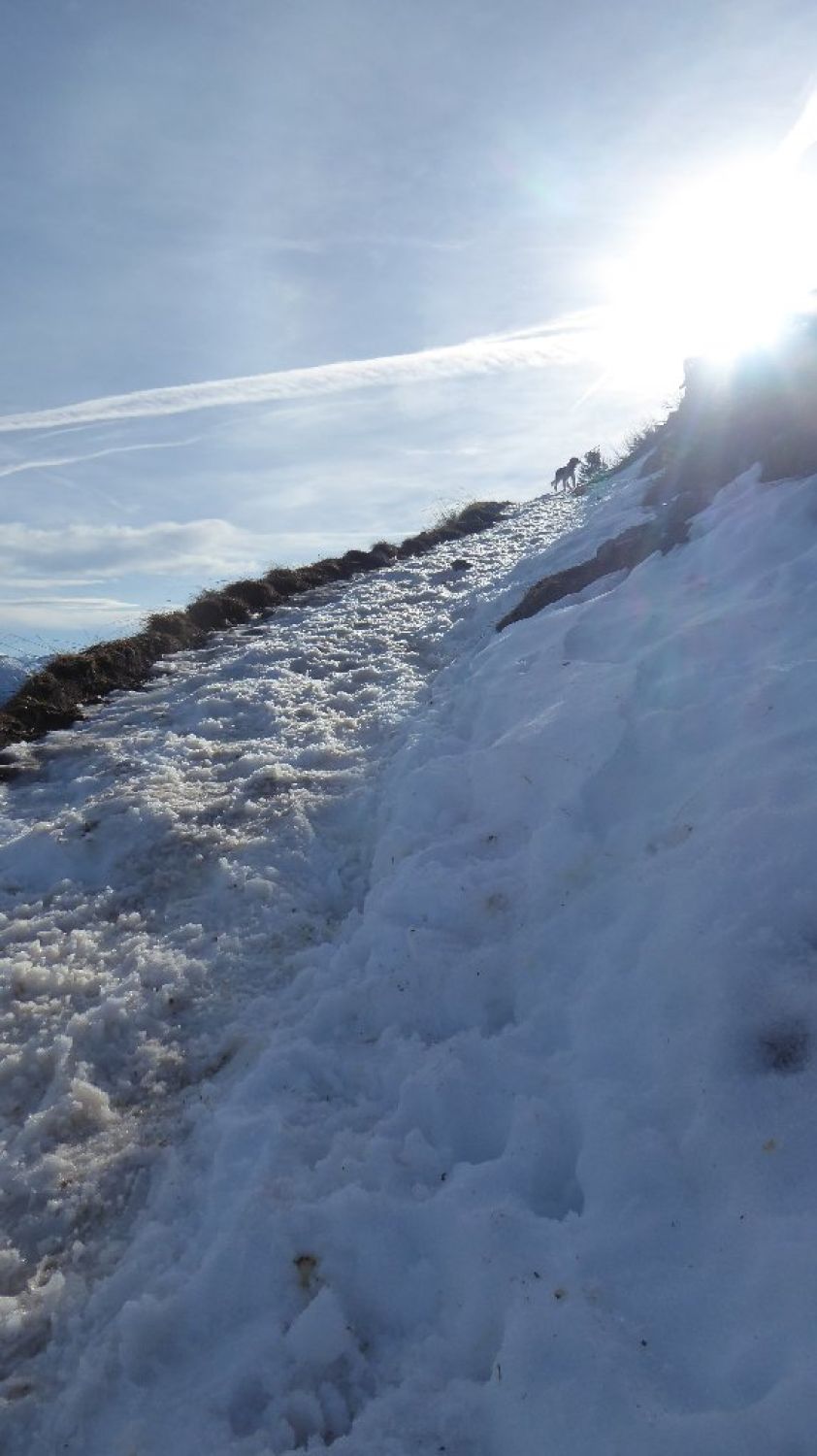 Frühjahrs Temperaturen oben leichte Bise. Wege unten trocken, mittig schmierig, ganz oben fest getretene z.T. eisige Spur. Stöcke und Schuh Spikes für ganz oben (ab Lifthäuschen) kein Fehler.