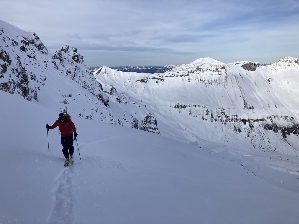 Start auf der Engstligenalp um 9 Uhr bei ca 6 Grad. Leichter Wind, in Böen mässig. Schnee: bester Sulz (wenn auch in sehr geringen Mengen). Ab ca 2100m dann zunehmend, aber mindestens oberflächlich gut durchfeuchtet. Ab ca 2400m frischer, etwas schwerer Pulver und nicht zu knapp. In der vom südwestwind gut geschützten Lage fast ohne erkennbaren Windeinfluss gefallen (oder vom Grat verfrachtet...). Dementsprechend in der Abfahrt ein Traum! Selbst der Nassschnee unterhalb liess sich dann noch erstaunlich gut fahren. Insgesamt bei den herrschenden Verhältnissen rundherum mindestens hellgrün.