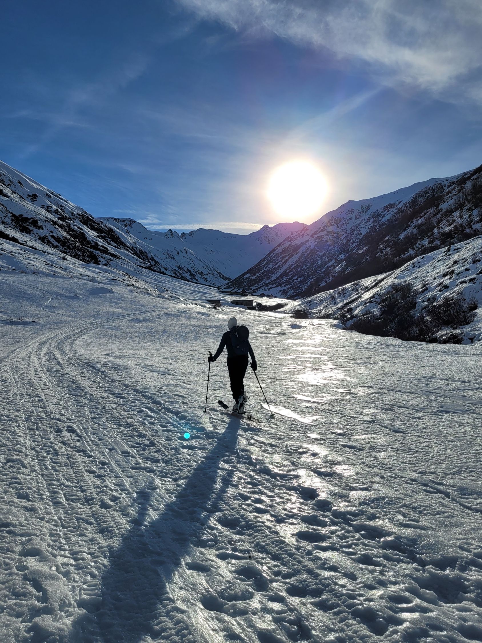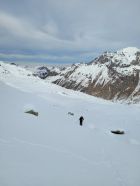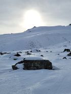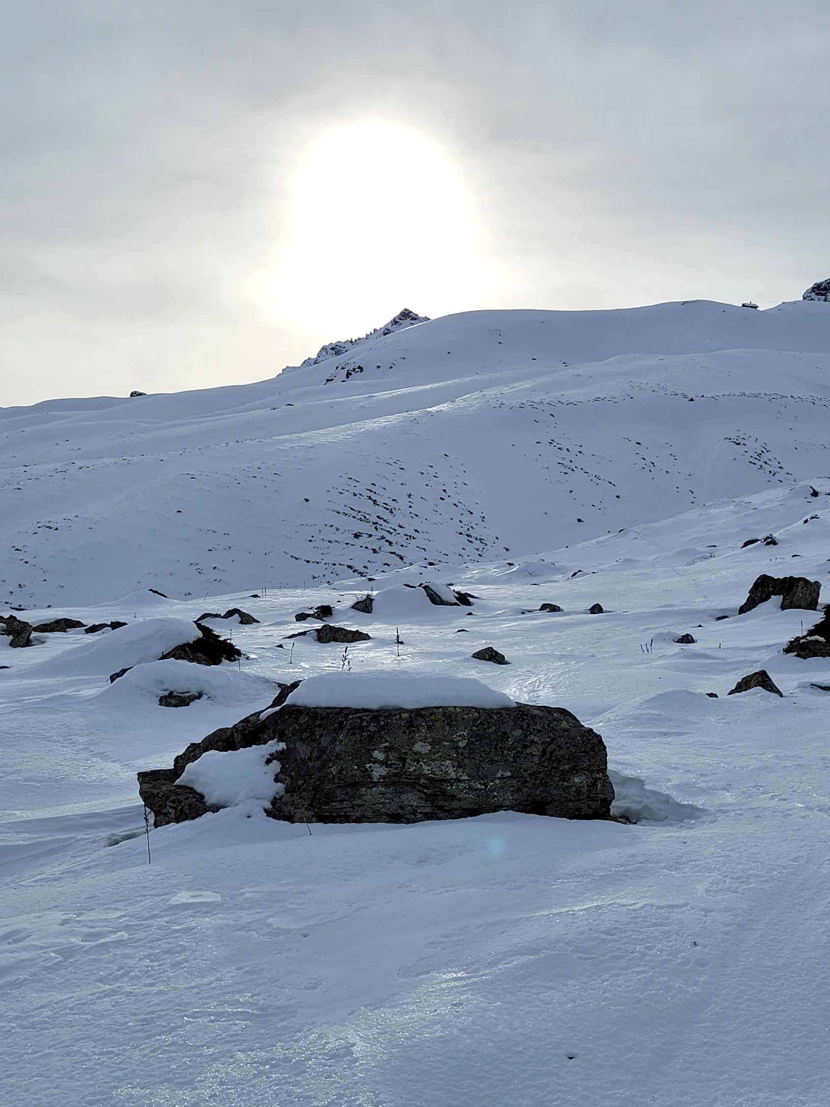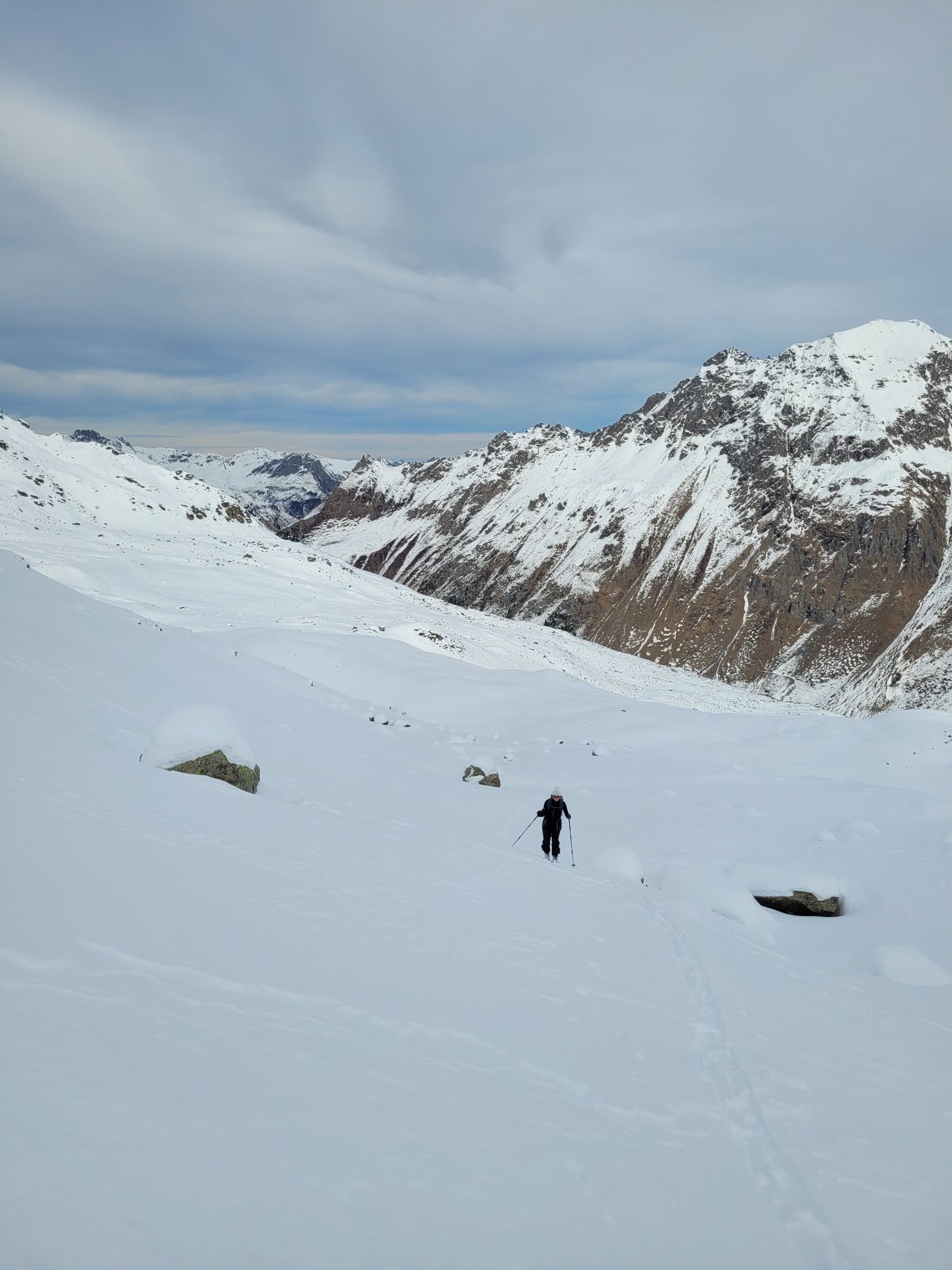 Fahrweg im Vergaldatal gut schneebedeckt, aber morgens eisig. Sommerweg Rossberg ebenso. Im Gelände wenig aber ausreichend Schnee, aber immer wieder versteckte Steine. Überwiegend nicht-tragender Deckel, Abfahrt daher mäßig. Keine Lawinenanzeichen wahrgenommen. Heute absolut einsam.