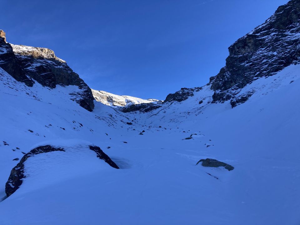 Sehr harter Schnee, Harscheisen wichtig. Immerhin kein Steinkontakt bei der Abfahrt. Oben windverpresst, unten Bruchharsch. Daher besser zur Kanzel queren und die Piste runter. 100hm vor Gipfel Skidepot wegen Schneemangel. Easy zu Fuß hoch.