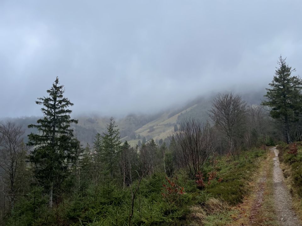 Ich spielte kurz mit dem Gedanken an eine Skitour in den Voralpen, beschloss aber statt dessen, mir einzureden, es sei November und alles in Ordnung und grad recht für eine Wanderung im Schwarzwald. Der Belchen Südaufstieg liefert jedenfalls ein hübsches Sportprogramm auch bei mässigem Wetter. Am Gipfel unangenehm feucht, windig und frisch. Weiter unten das bekannte und ungeliebte latschige Wetter, das wir halt jetzt so haben. Den Abstieg wählte ich via Hohe Kelch und zwar in der Hoffnung, Gemsen (neudeutsch: Gämsen) zu sehen, bei mässigem Wetter und wenig Leuten ist das möglich. Ich wurde auch nicht enttäuscht, 6-7 Stück konnte man aus der Ferne beobachten. Zufrieden nahm ich den Rückweg nach Hau unter die Füsse.