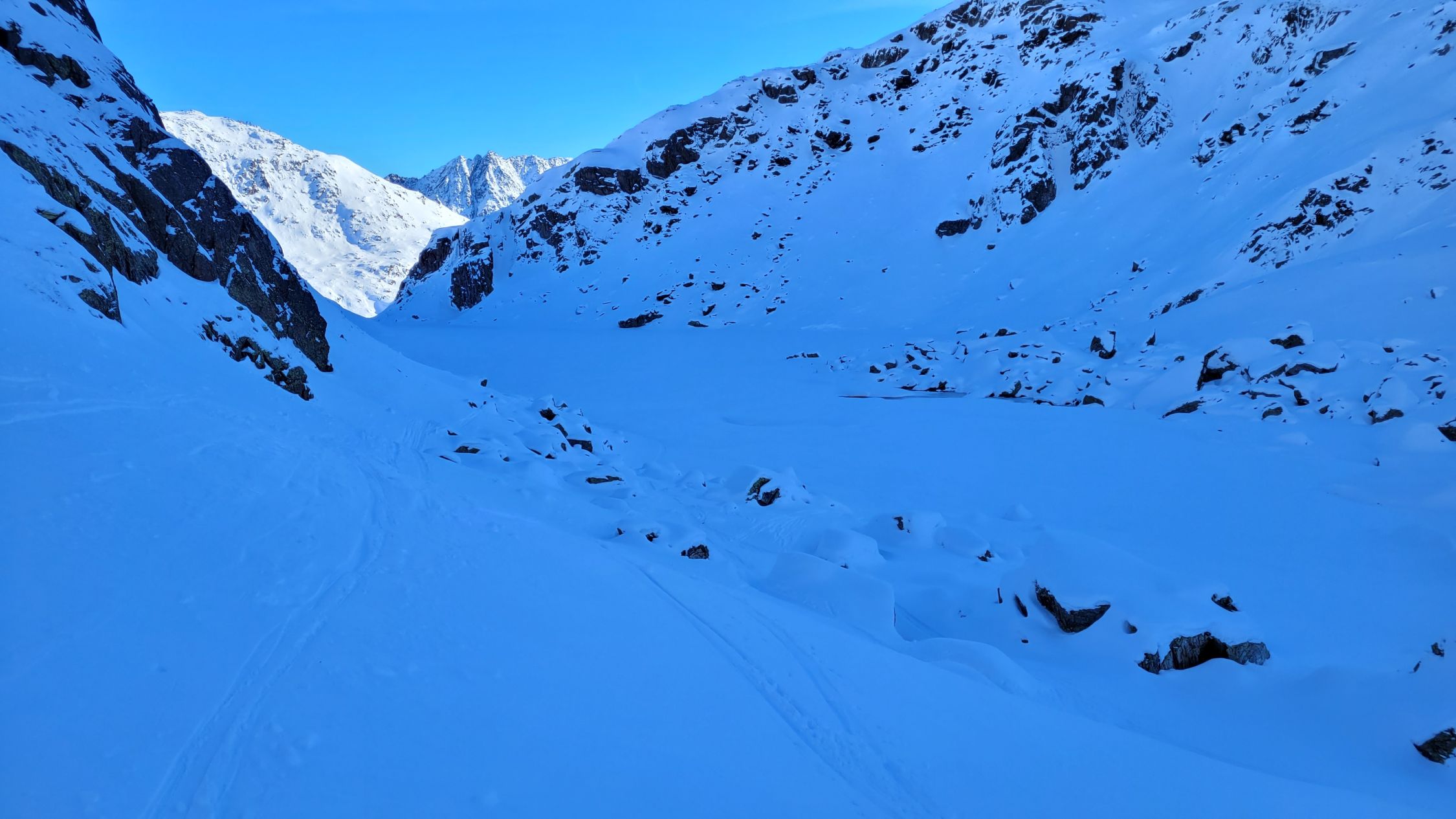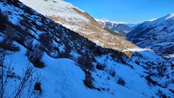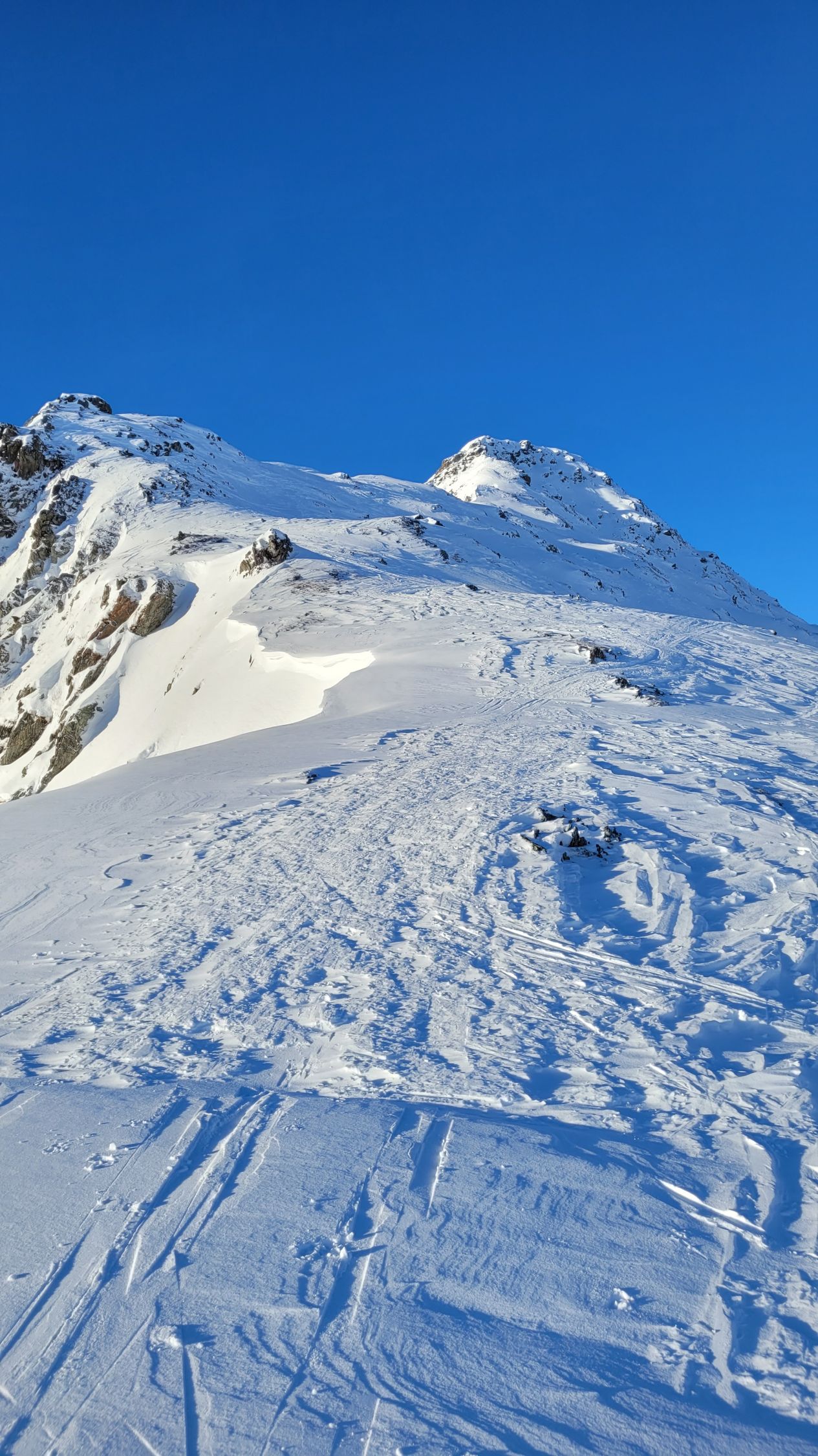 Gute Spur auf den Pazolastock, (knapp) genug Schnee. Beim Übergang Grat schmale gute Spur, stürzen verboten. Ab Pazolastock problemlos über den Grat zur Martschallücke. Kurzer Fussaufstieg in gutem Trittschnee, und weiter auf den Gipfel. Abfahrt ohne Steinkontakt zum Lai da Tuma, weiter in ruppigem Schnee zum Hüttenweg. Bis zum P.1842, kurz davor sehr dünne Schnneauflage, kurz Ski tragen. Aufstieg zum Pass problemlos.