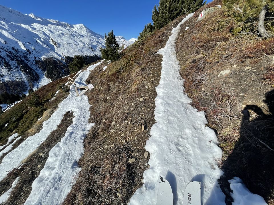 Beim Aufstieg durch den Wald fehlt der Schnee oft komplett und ski müssen immer wieder abgeschnallt werden. Bei der Abfahrt oben Pulver und knapp genügend Schnee für ein paar schöne turns, ab 2200 sehr wenig Schnee, mit ein bisschen Vertrauen aber dann doch abgefahren bis „wiitialpä“. Von dort dann zu fuss dem weg entlang runter ins tal bis „Eggali“.
