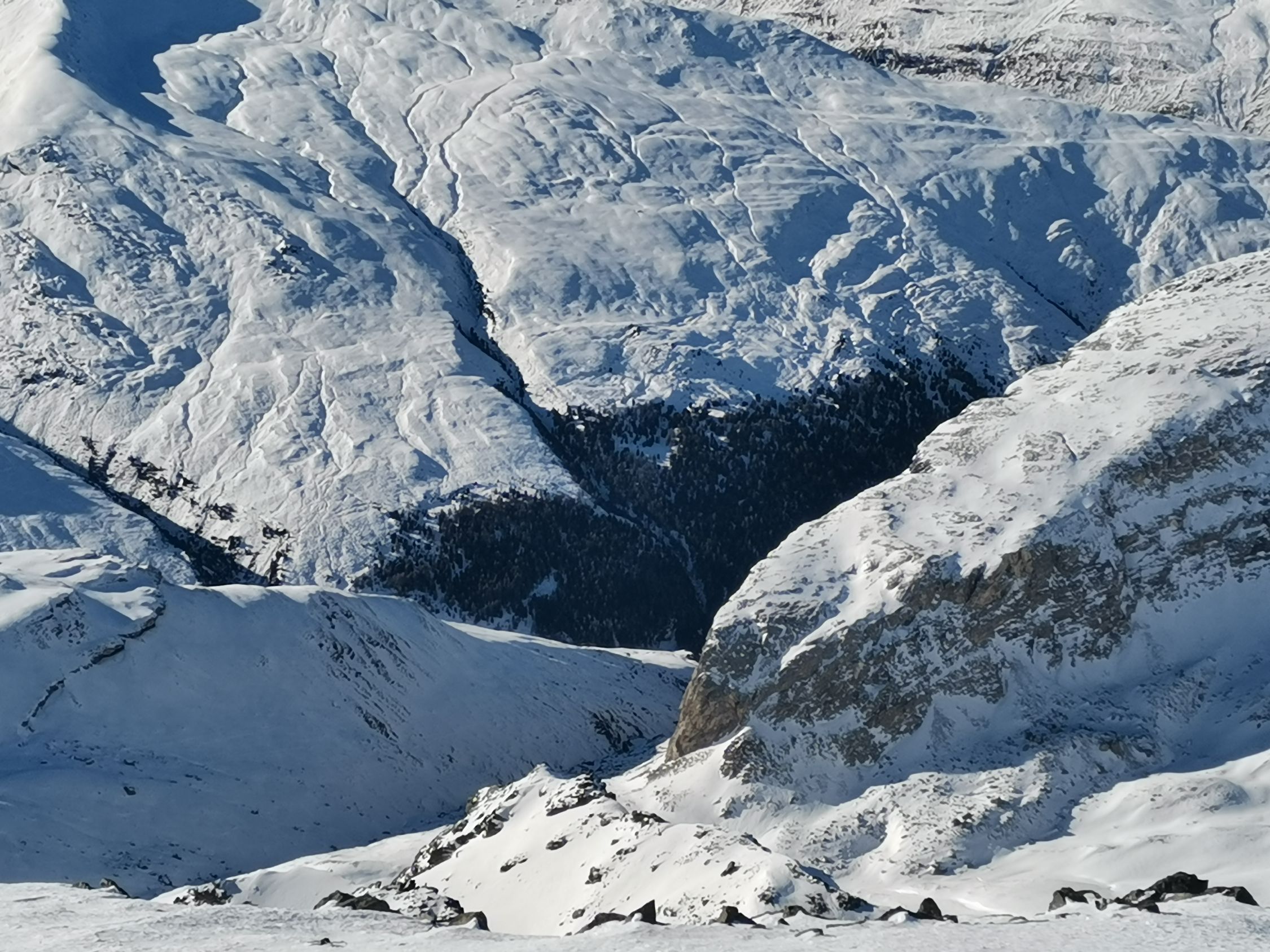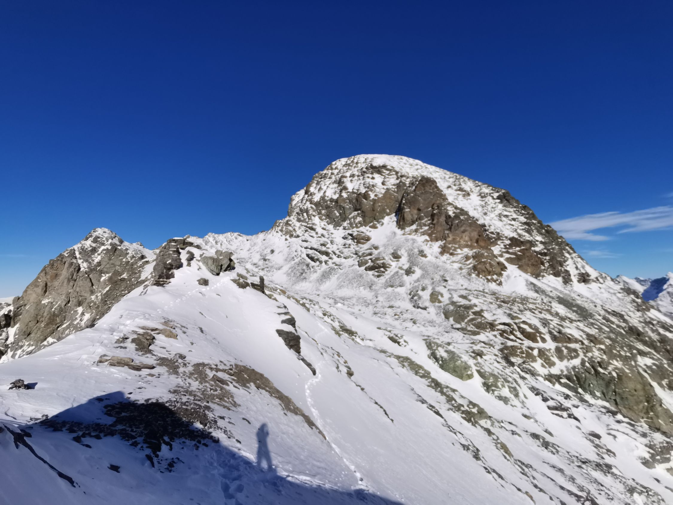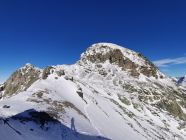 Bis zur Bachquerung kurz vor P. 2515 alles ohne Schneeschuhe. Ab dann geschlossene Schneedecke, aus der viele Steine schauen. In den steilen Hängen ist die Spurarbeit mühsam. Der Deckel trägt nicht, man bricht ein. Der Schnee darunter ist grieslig, bietet wenig halt, man rutscht zurück. Dies speziell im steilen, engen Couloir zu P. 3140 hoch. Die Querung hinüber zum Gipfelaufbau dann erholsam. Schneeschuhe im Westsattel deponiert und durch die breite Rinne am Westgrat auf den Gipfel geklettert.