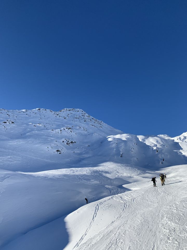 Gerade so genug Schnee. Abfahrt war dann doch nur wieder zur Passhöhe. Viele Tourenfahrer unterwegs.
