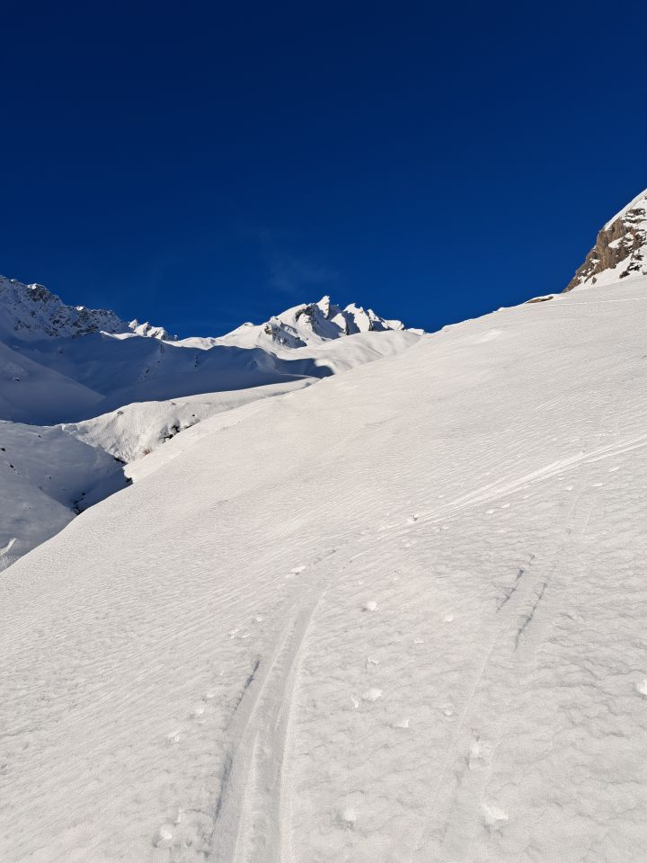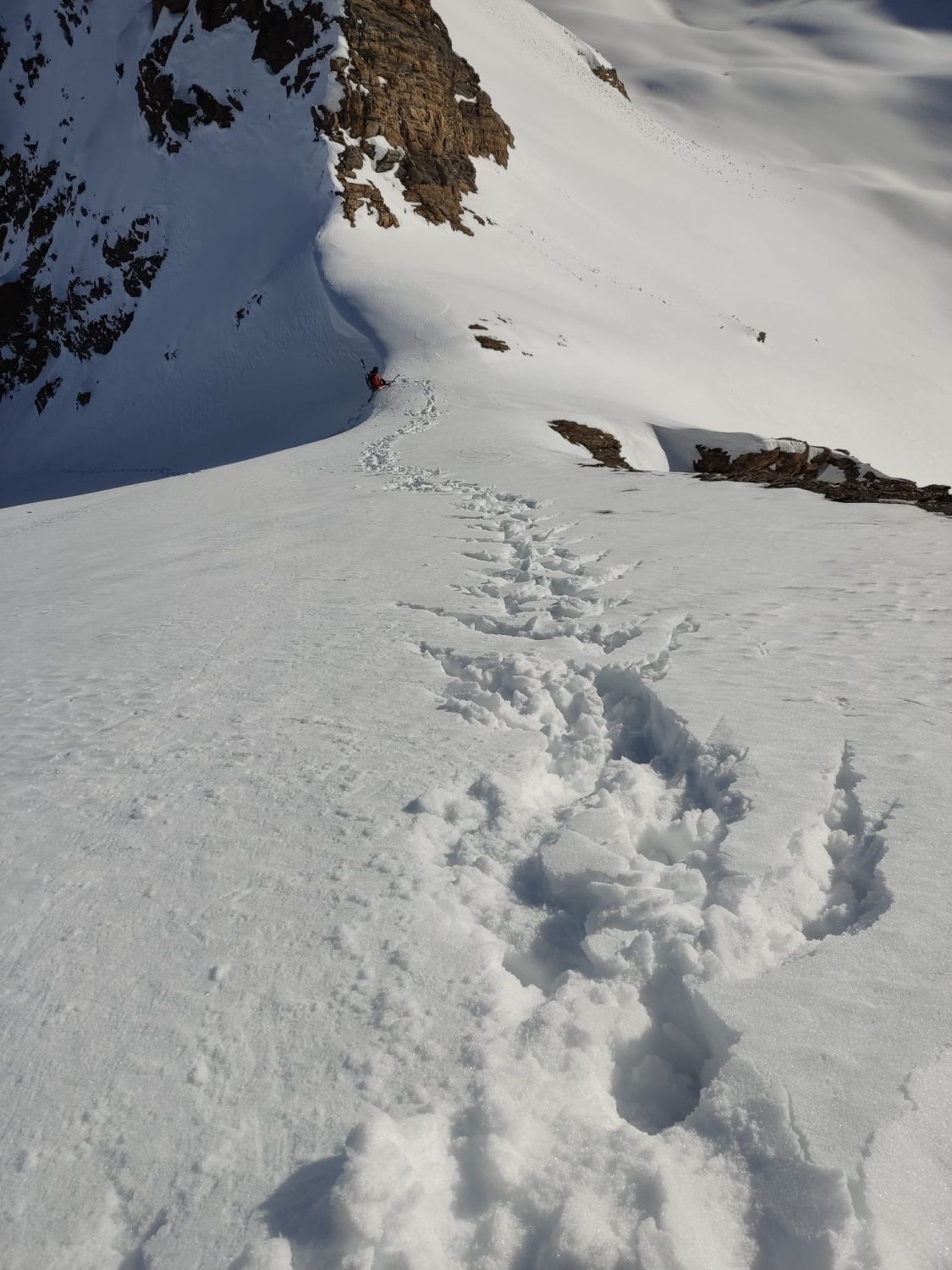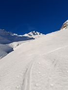 Wenig aber genügend Schnee von Start bis Ende Torrent,da kurz zu Fuss über die steilen Grashänge rechts bis Ende,Ab Comba alles suber top eingeschneit mit Unterlage.Mit Ski bis erstes Drittel Culi,dann zu Fuss in gutem Trttschnee bis Gipfel.Schartenwächte nur klein.Abfahrt in sehr schönem Pulver,zum Teil etwas Windgepresst.Da Sonne den leichten Harstdeckel aufgelöst hatte dann super Pulverabfahrt über die weiten Hänge bis Torrent.Ab hier Rodeotraverse über Lawienenzüge und Restabfahrt tip top auf Hartschnee.Nur 1x Bachquerung,