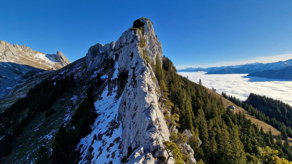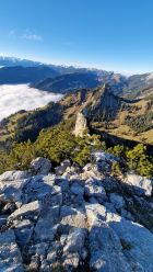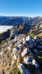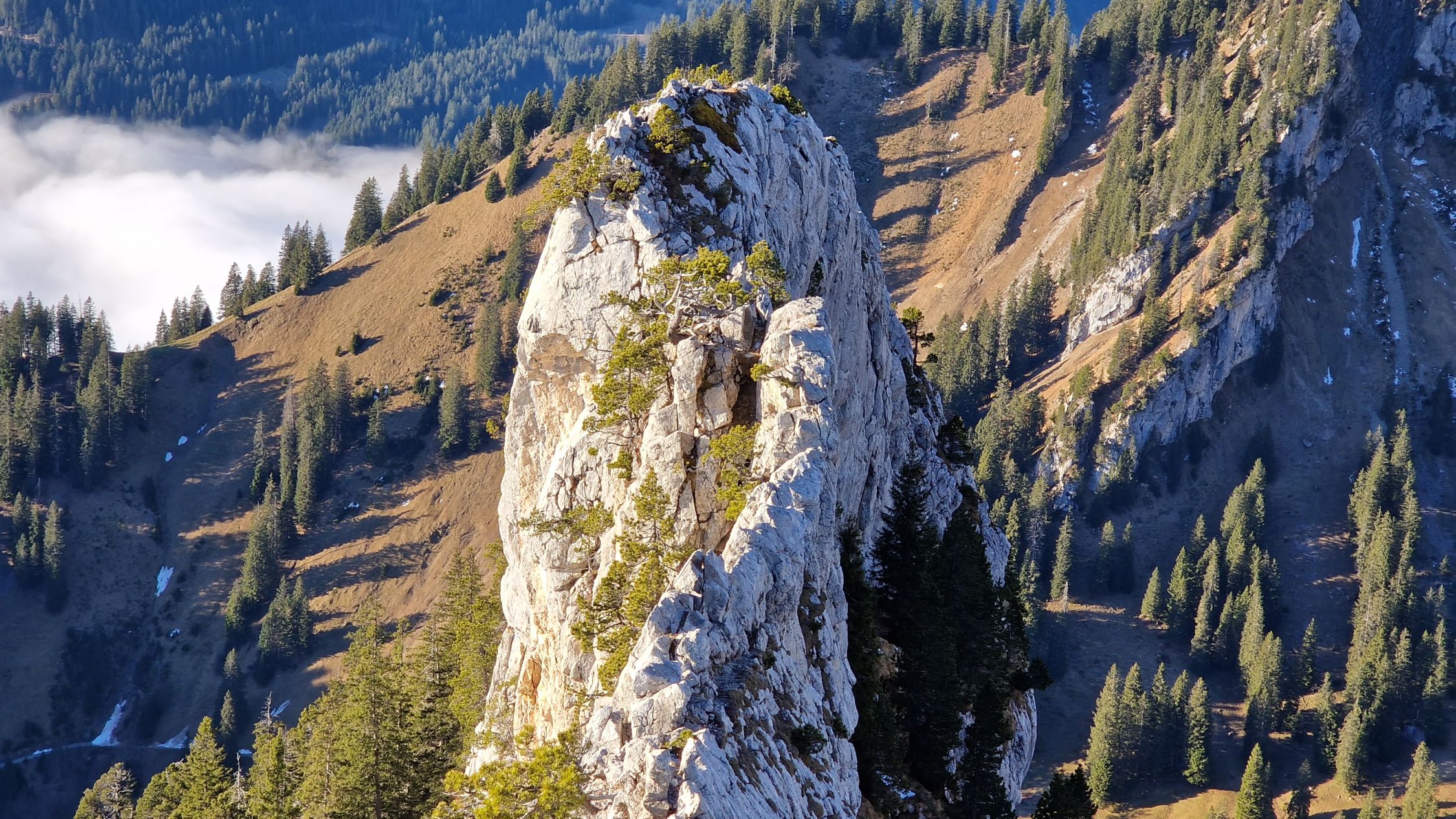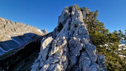 Allgemein sehr gute Bodenverhältnisse auf dem Weg zum Einstieg am ersten Felsturm bei 1660m Höhe, an der Wiese dorthin bergauf war der Boden teilweise etwas gefroren, war aber keine Rutschgefahr, ich bin ungesichert alleine die rechte Variante auf den Grat hoch geklettert, wo es im oberen Bereich einen Bohrhaken gab.