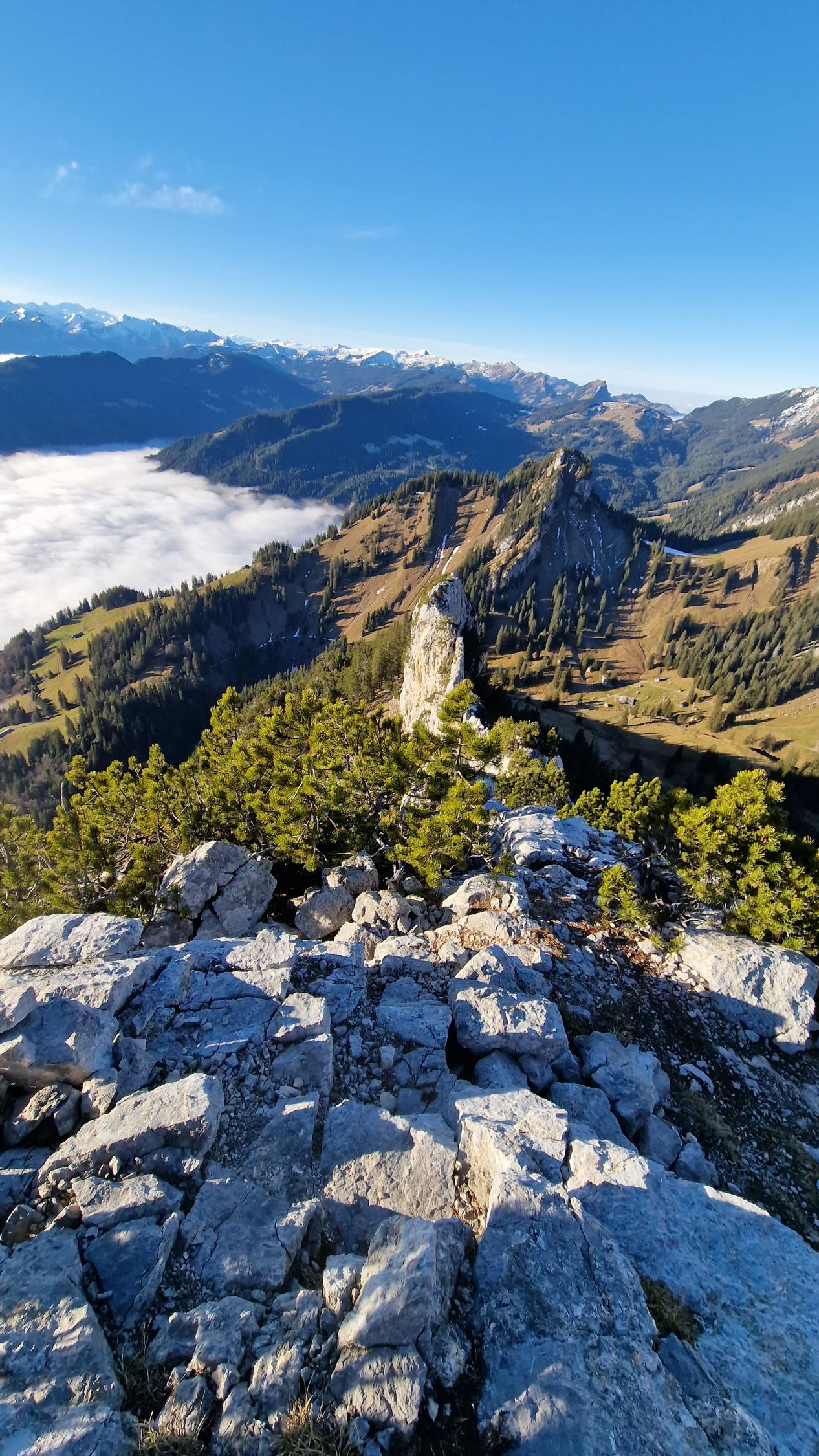 War gegen 11.15 Uhr völlig alleine auf dem Matthorn, da konnte man das tolle Panorama geniessen, unter mir war bis etwa 1100 Metern Höhe eine geschlossene Nebeldecke, sah richtig geil aus.