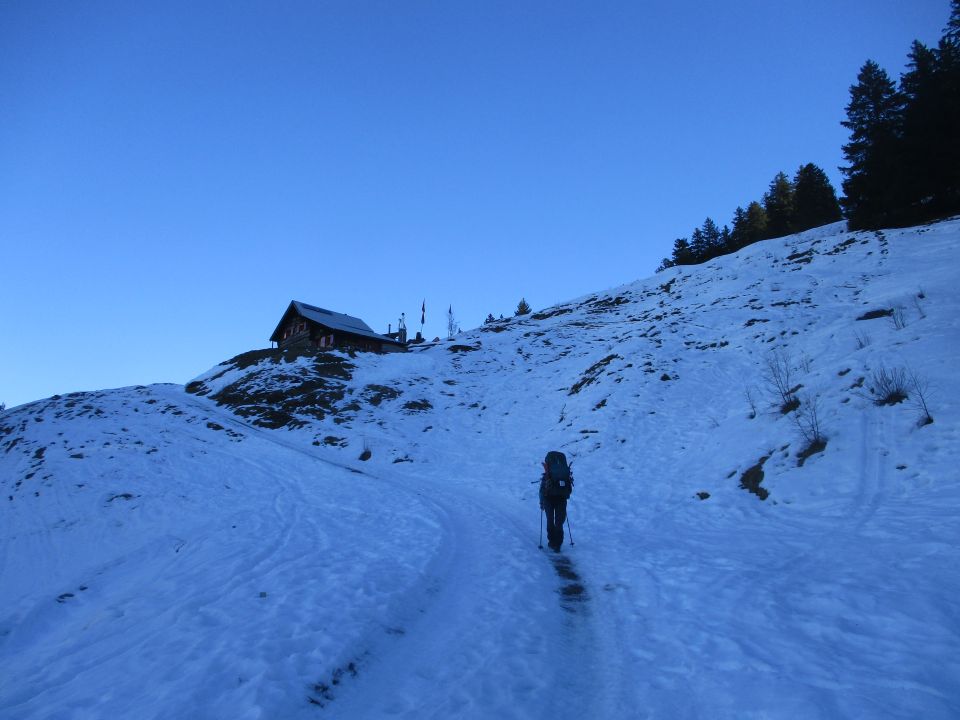 Wer nicht unbedingt Wert darauf legte, vom Ausgangsort an mit Schneeschuhen zu gehen, hatte ab ca. 1750 m ausgezeichnete Schneeverhältnisse. Griffig durchgefroren und durchgehend tragend.