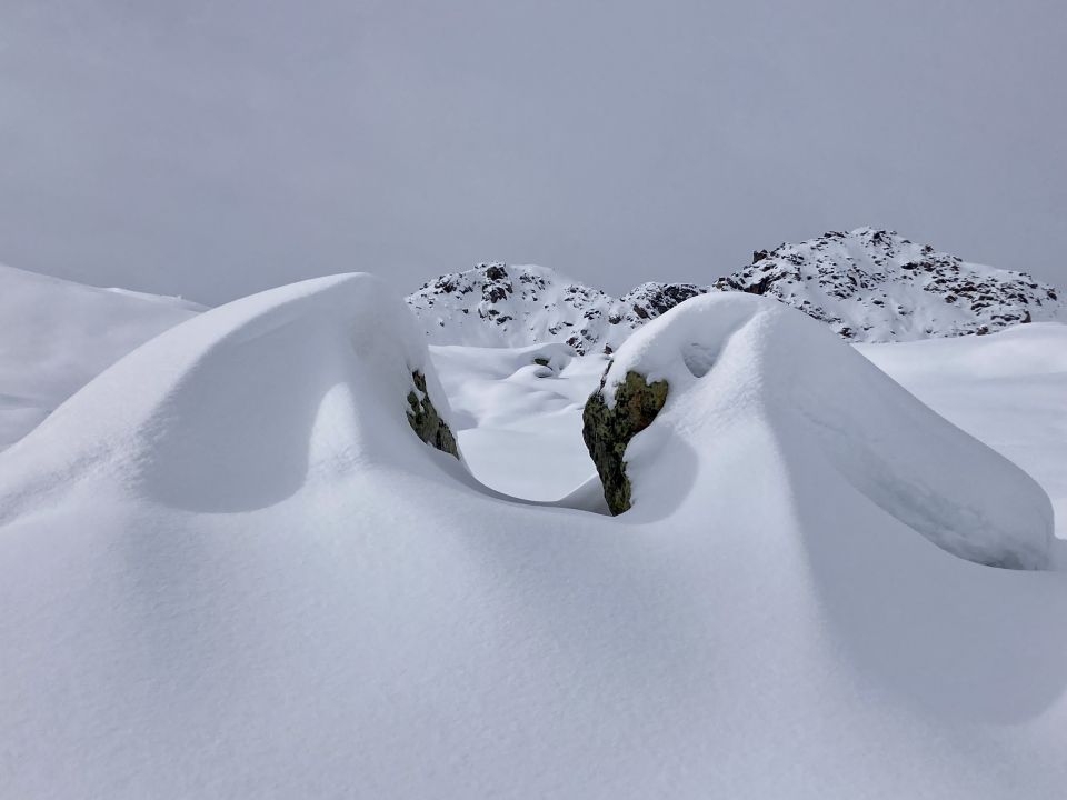 In der Nacht ist nochmals etwas Neuschnee dazugekommen, sodass für diesen Winter relativ viel Schnee vorhanden war. In den oberen Lagen ab der Galmihornhütte war dann reichlich Schnee in Pulverform da. Ab Treichbode deutlich übere einen Meter Schnee. Dadurch, dass den ganzen Tag lang die Sonne durch die Hochbewölkung verdeckt wurde, blieb die Schneequalität gut. In den oberen Lagen war das Licht sehr diffus, so dass die optimale Linie schwierig zu finden war.