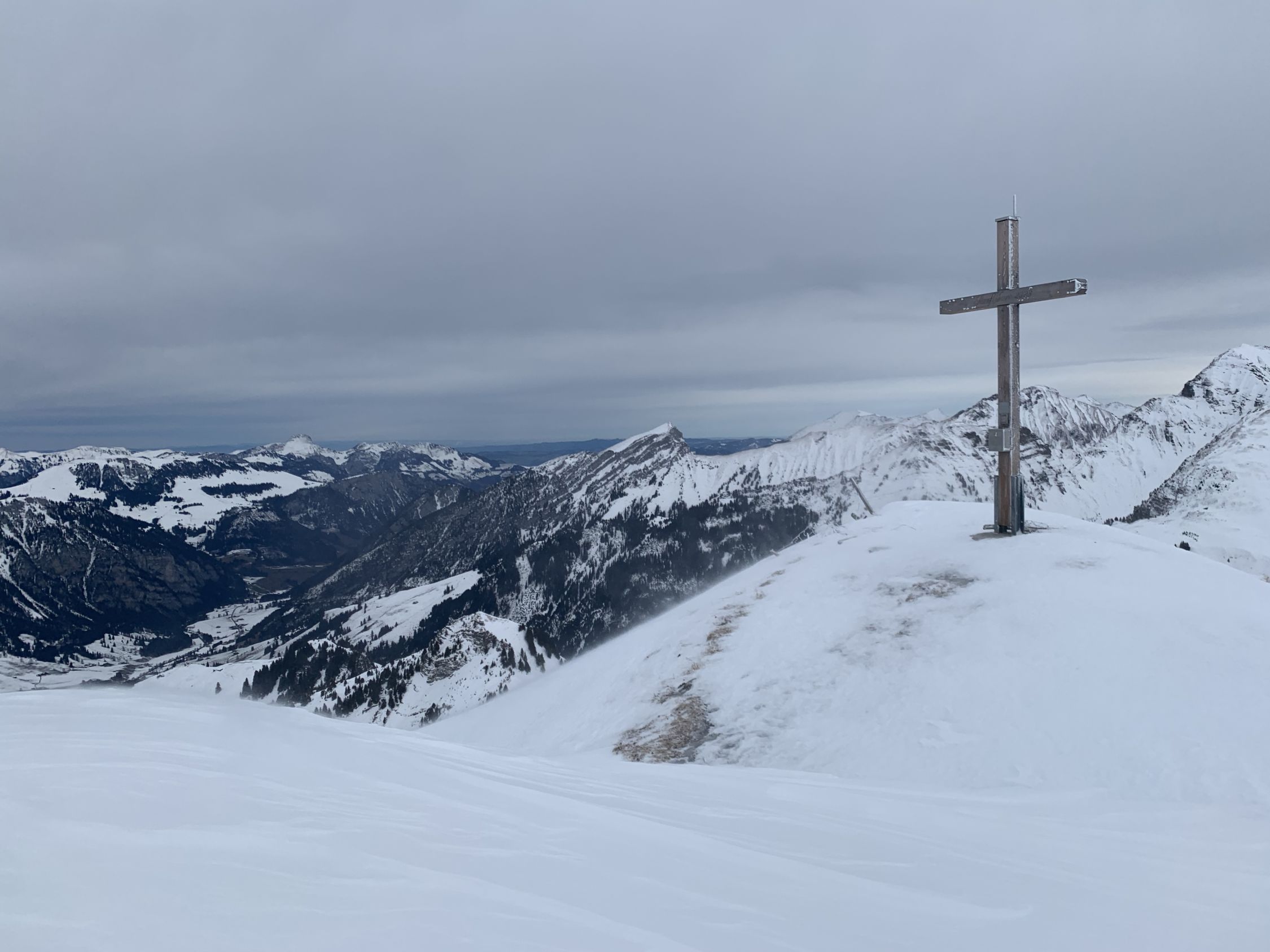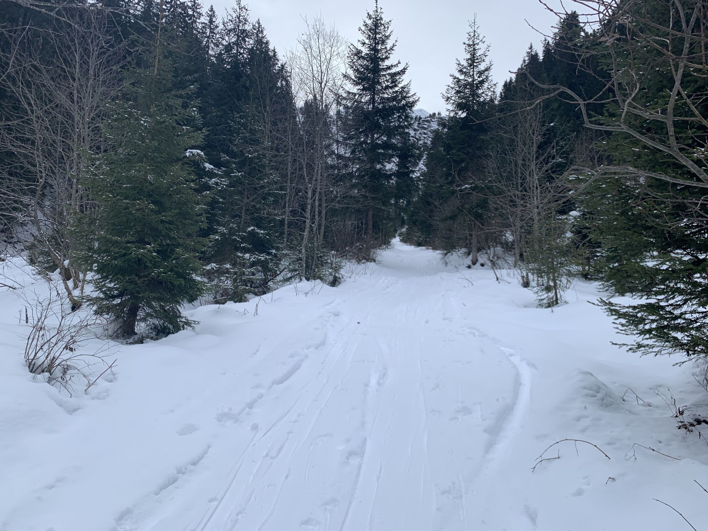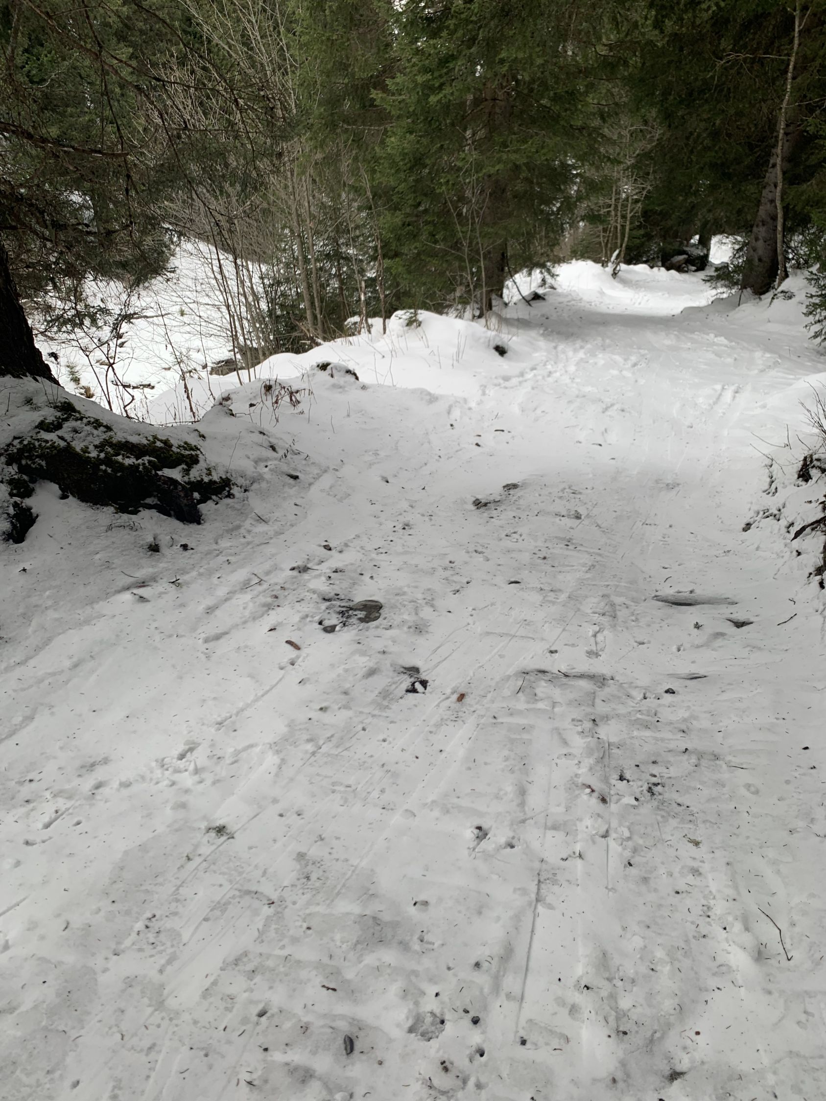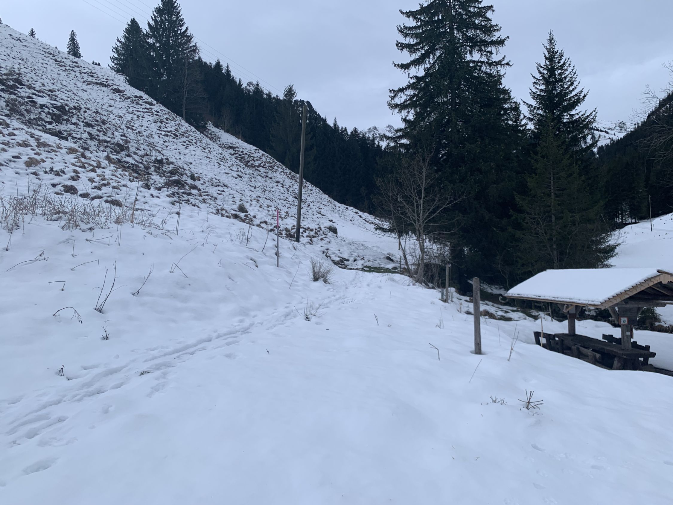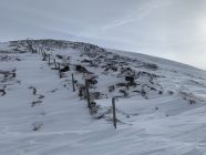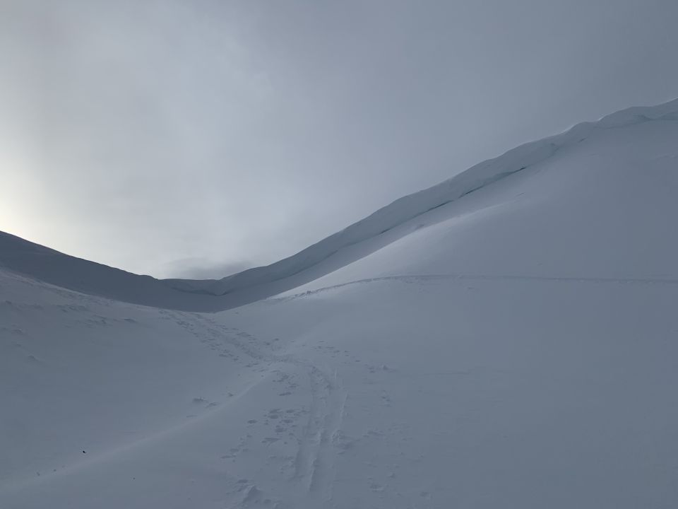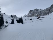 Momentan ists unten sehr knapp, die Abfahrt im Wald ist stellenweise ziemlich kriminell. Etwas weiter oben dann Bruchharst, und ab Grimmifurggi abgeblasen. Bei Grimmifurggi hat sich eine mächtige Wächte gebildet, die aber von unten her gesehen links gut umgangen werden kann. Alles in Allem kein Genuss aber immerhin möglich.