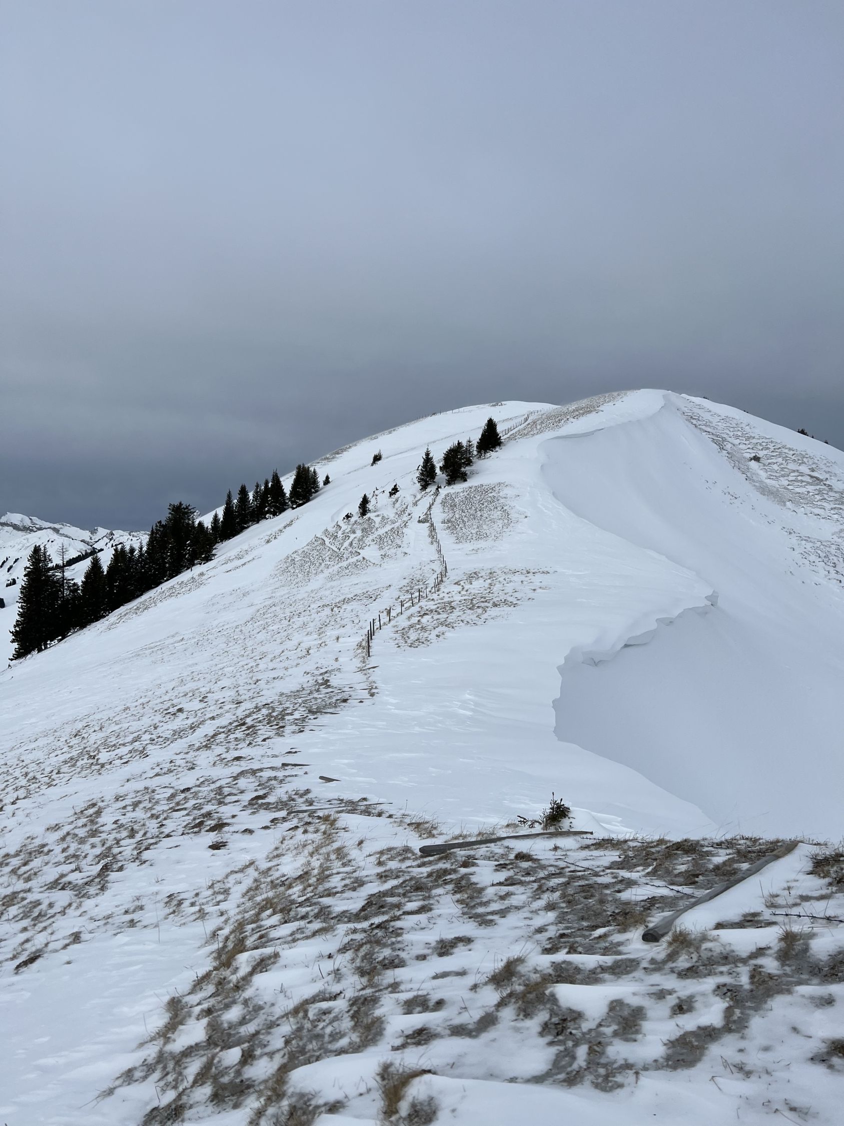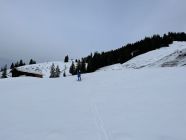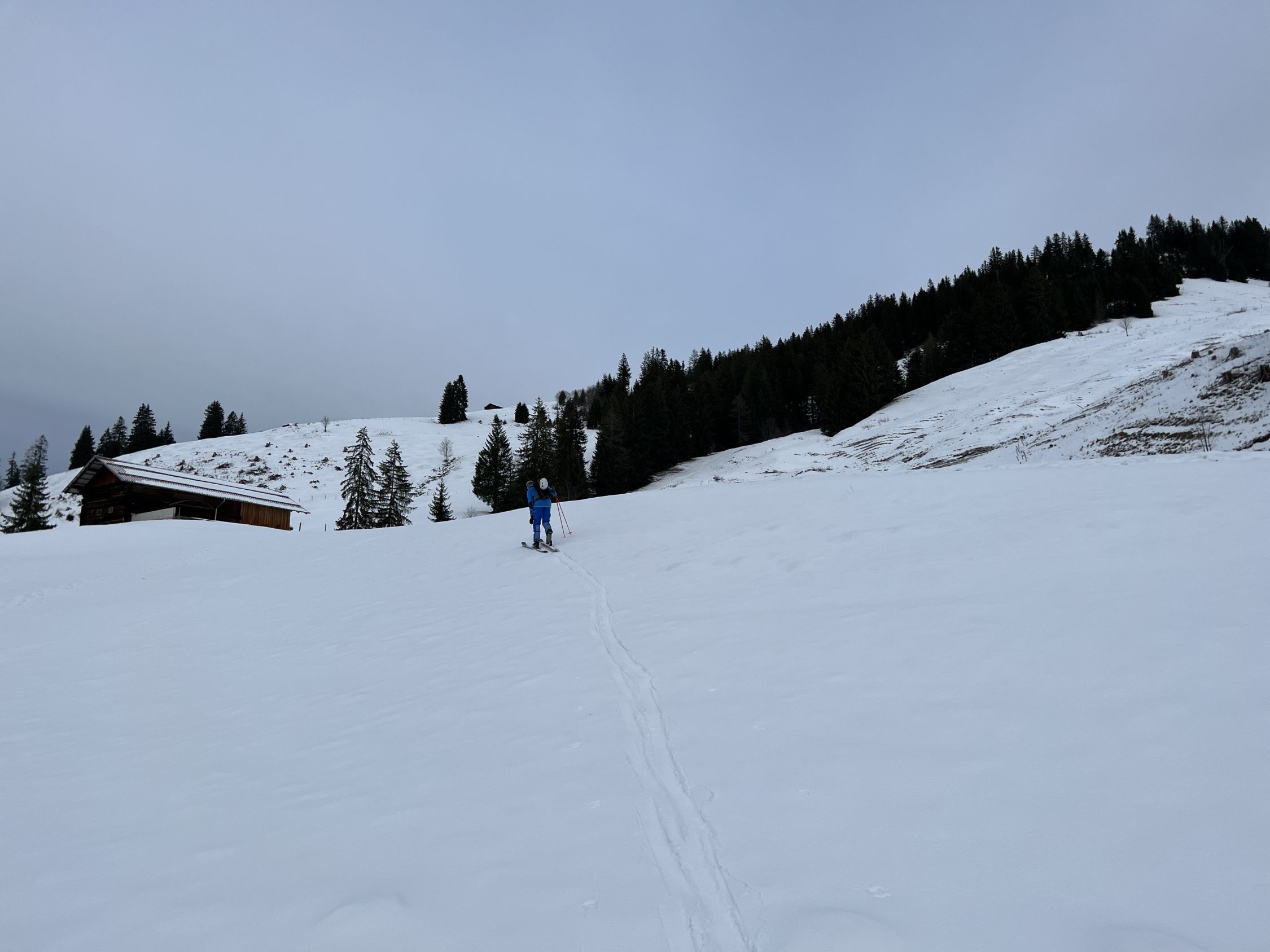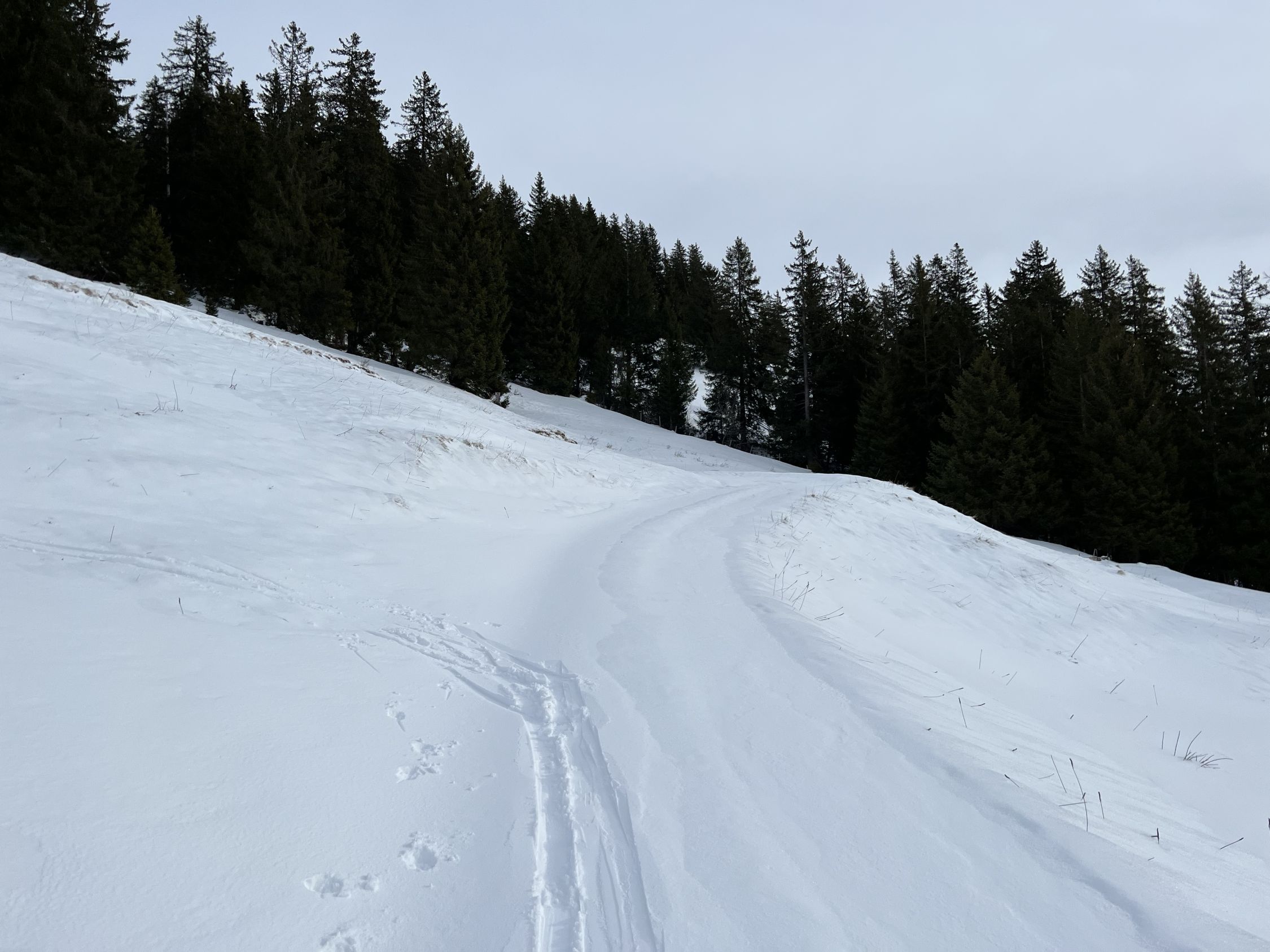 Der Wind und Regen hat dem wenigen Schnee sehr zugesetzt. Der Gipfelhang ist abgeblasen. Beim ersten Teil durch den Wald müssen die Skis getragen werden. Wir sind etwas weiter Links aufgestiegen und abgefahren als die beschrieben Route.