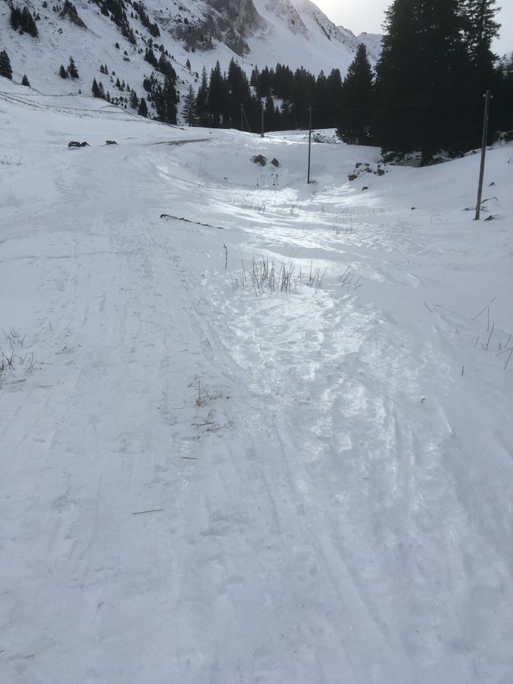 Ich wollte erst auf den Ochse; da hatte es aber unten kaum Schnee. In der unteren Hälfte zur Bürgle geht es bzgl. Schnee grad; es hat auf dem Weg eine feste Unterlage; bis zum Morgetepass wird es dann besser. Oben hat's vieles verblasen; siehe Foto. Daher bin ich unter dem Gipfel umgekehrt. Danach ging ich auf den Birehubel, was etwas besser war.