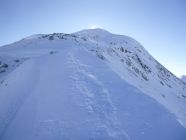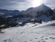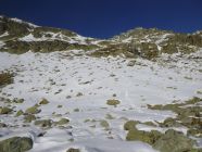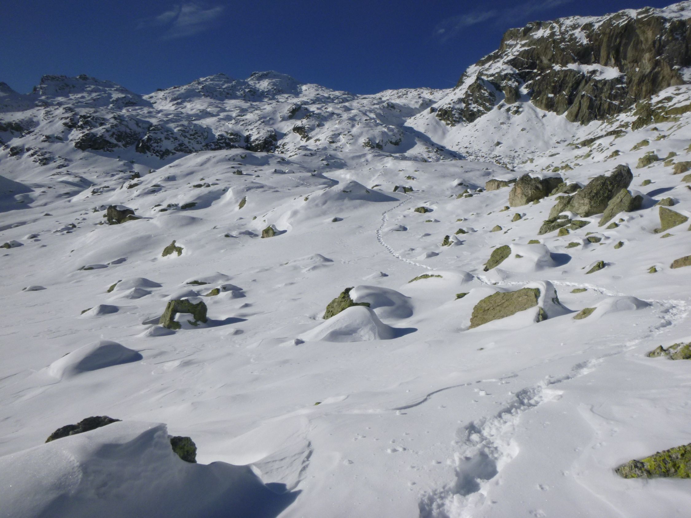 Vor mir liefen 4 Italiener mit Schneeschuhen. 2 von ihnen kehrten nach oberem Steinmann (2725 m) wieder um. Ich stieg über Blaunca auf, da auf den Hängen südwestlich vom Bachbett Ova da Mulin mehr Schnee lag. Den Lej Nair umging ich nordseitig.