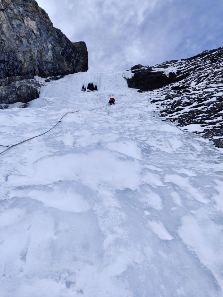 Kompakte Eisauflage. Eis aufgrund der Kälte etwas spröde. Unbedingt auf Lawinenlage achten. Zwei größere Abgänge über die Routen. Der starke Wind hat reichlich Schnee oberhalb der Eisfälle verfrachtet.