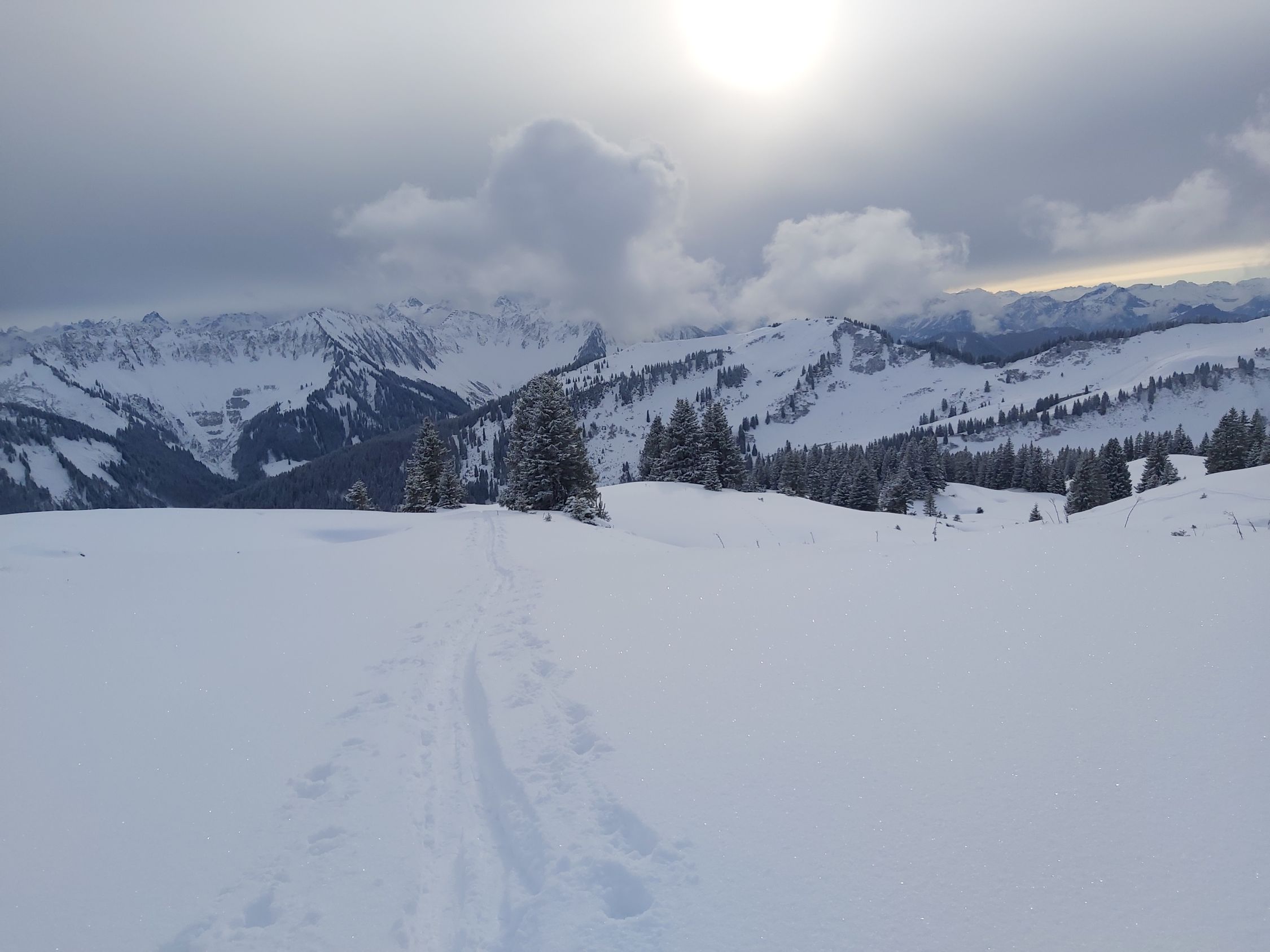 Wollte zuerst über Passstrasse zum Gehrenfalben, wegen besserer Schneeverhältnisse als erwartet bin ich dann über garnitzaalp zur Matona hochgestiegen.