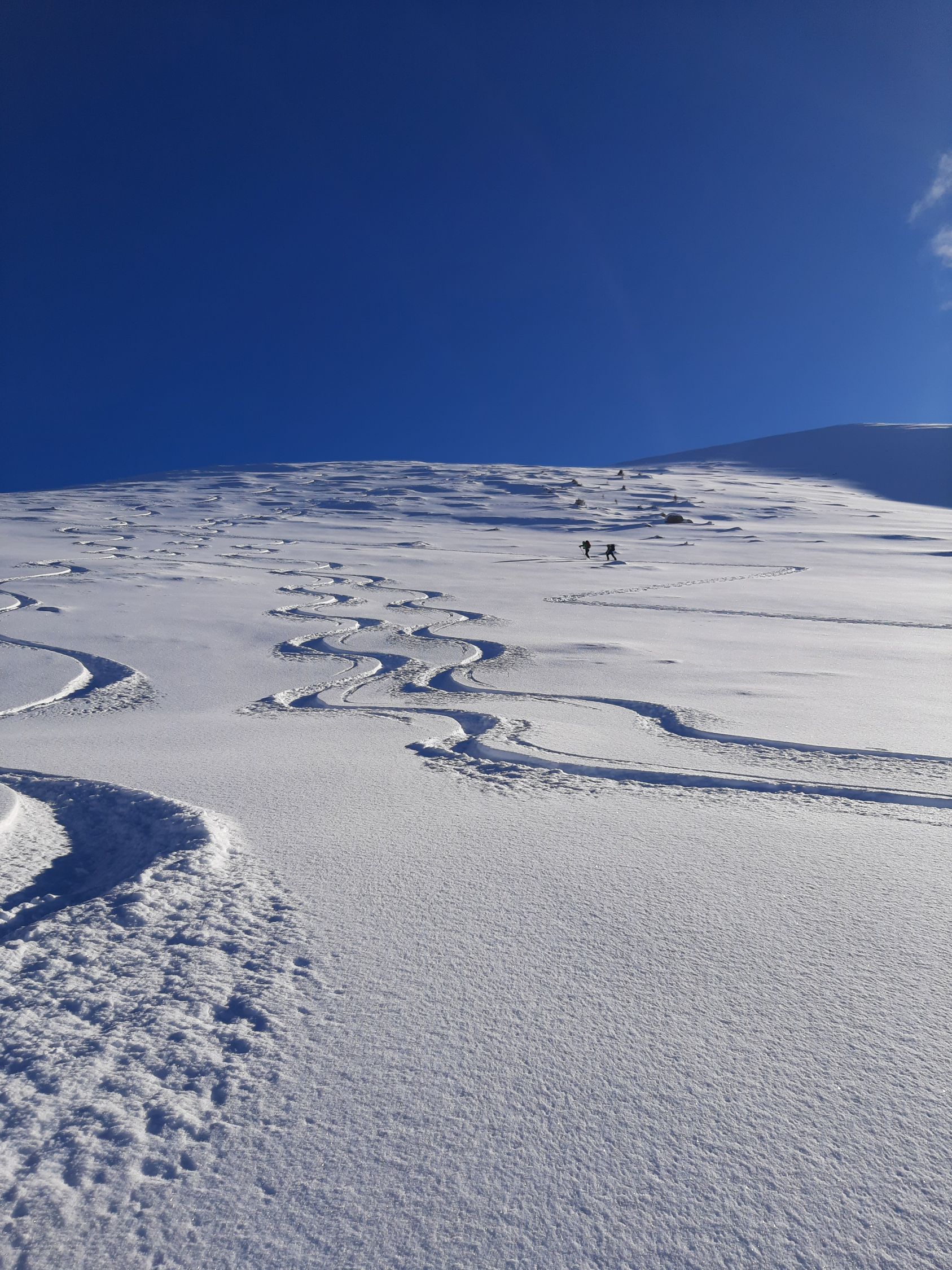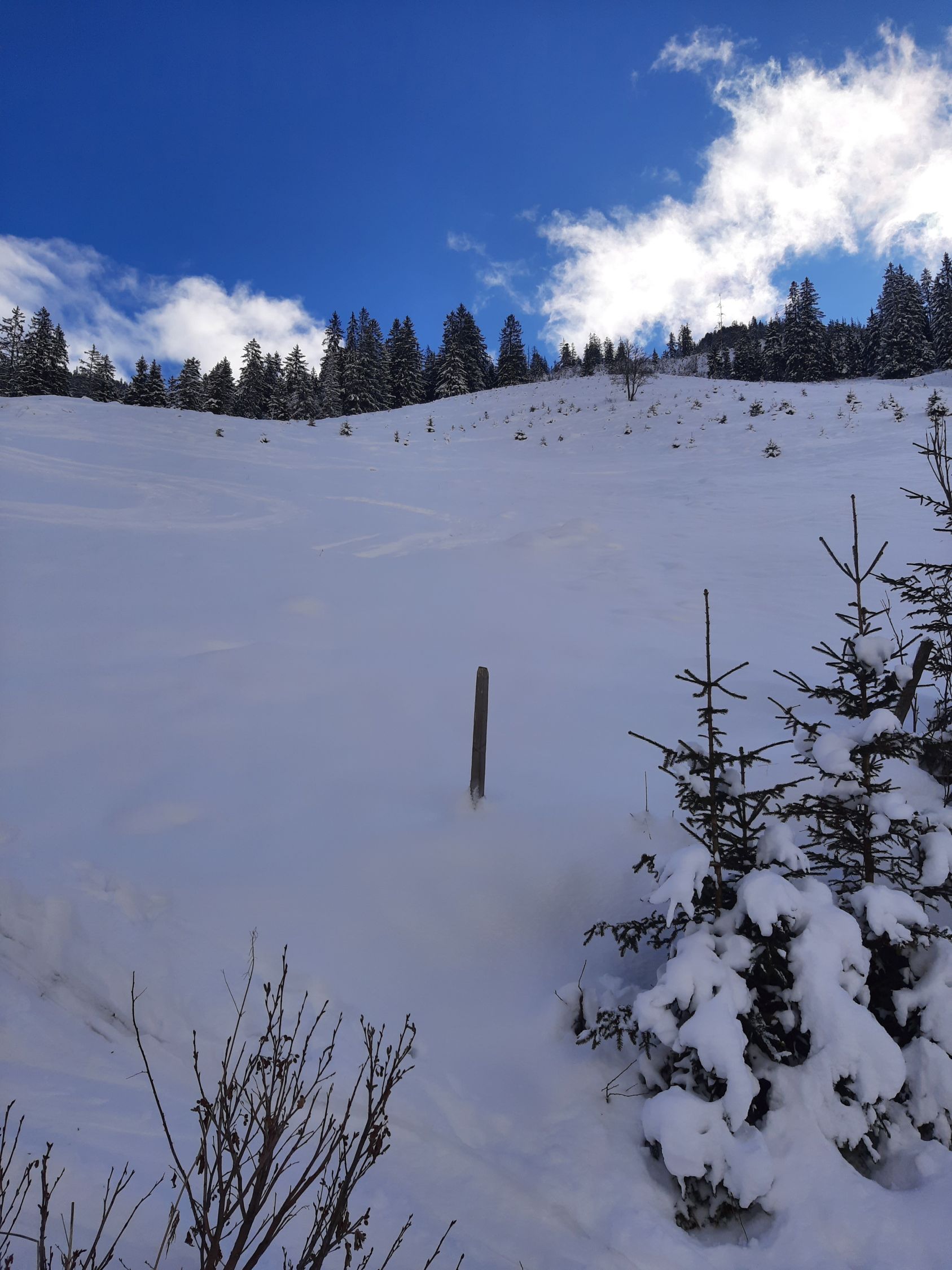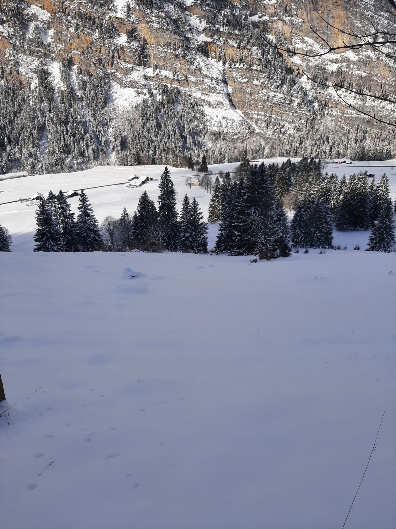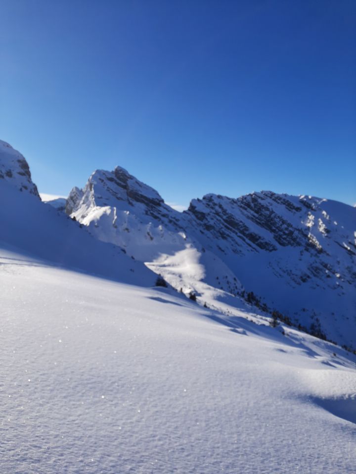 Abfahrt: Oben superschöner Pulver. Aber den einen oder anderen Stein erwischt man dann doch. Bis ca. 1700müM kann gut abgefahren werden. Dann beginnt der Waldhindernislauf um Sträucher, über Baumstämme und Steine... Vorsichtiges Abfahren hilft, ist aber zum Teil sehr mühsam. Einzelne Abschnitte sind zu Fuss einfacher. Vor allem im Wald bei ca. 1500müM. Das letzte Stück kann dann über Grassmutten oder auch mal einen Stein wieder recht gut gefahren werden.