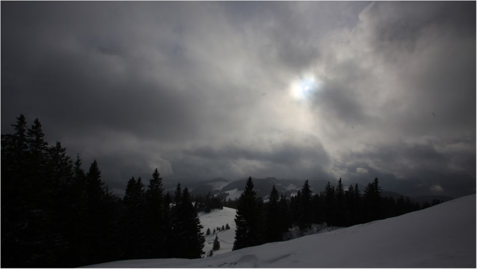 Ziemlich frisch, kalter Wind aus NW, auf dem Gipfel allerdings windstill. Ansonsten dichte Wolken, hin und wieder ein Sonnesntrahl. Sonst typisches Winterwetter.